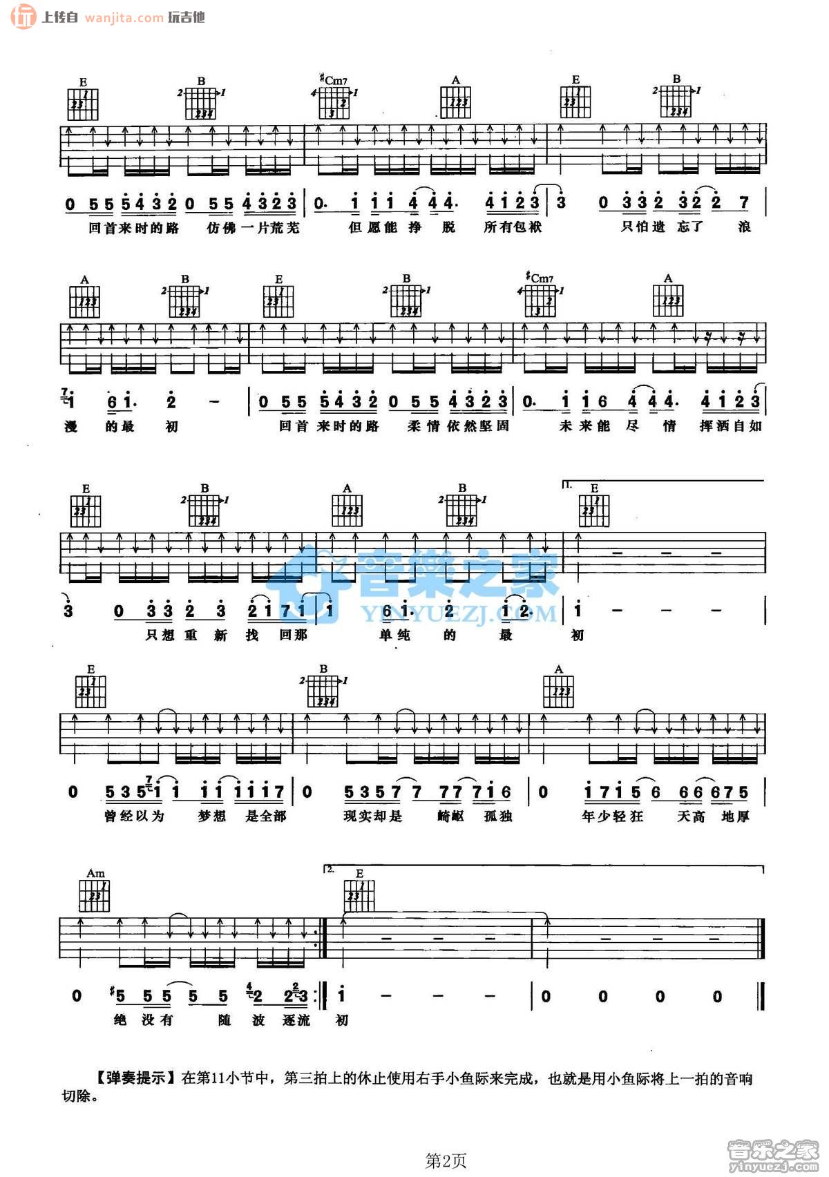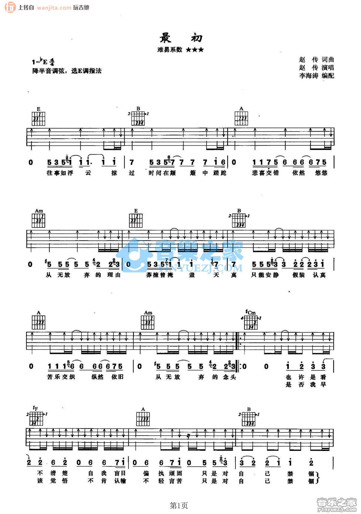 曲谱介绍: 《最初》吉他谱,总共1高清图片谱,原调为降E调,降半音调弦,选用E调指法,节拍4/4拍,不使用变调夹,弹唱难度初级。