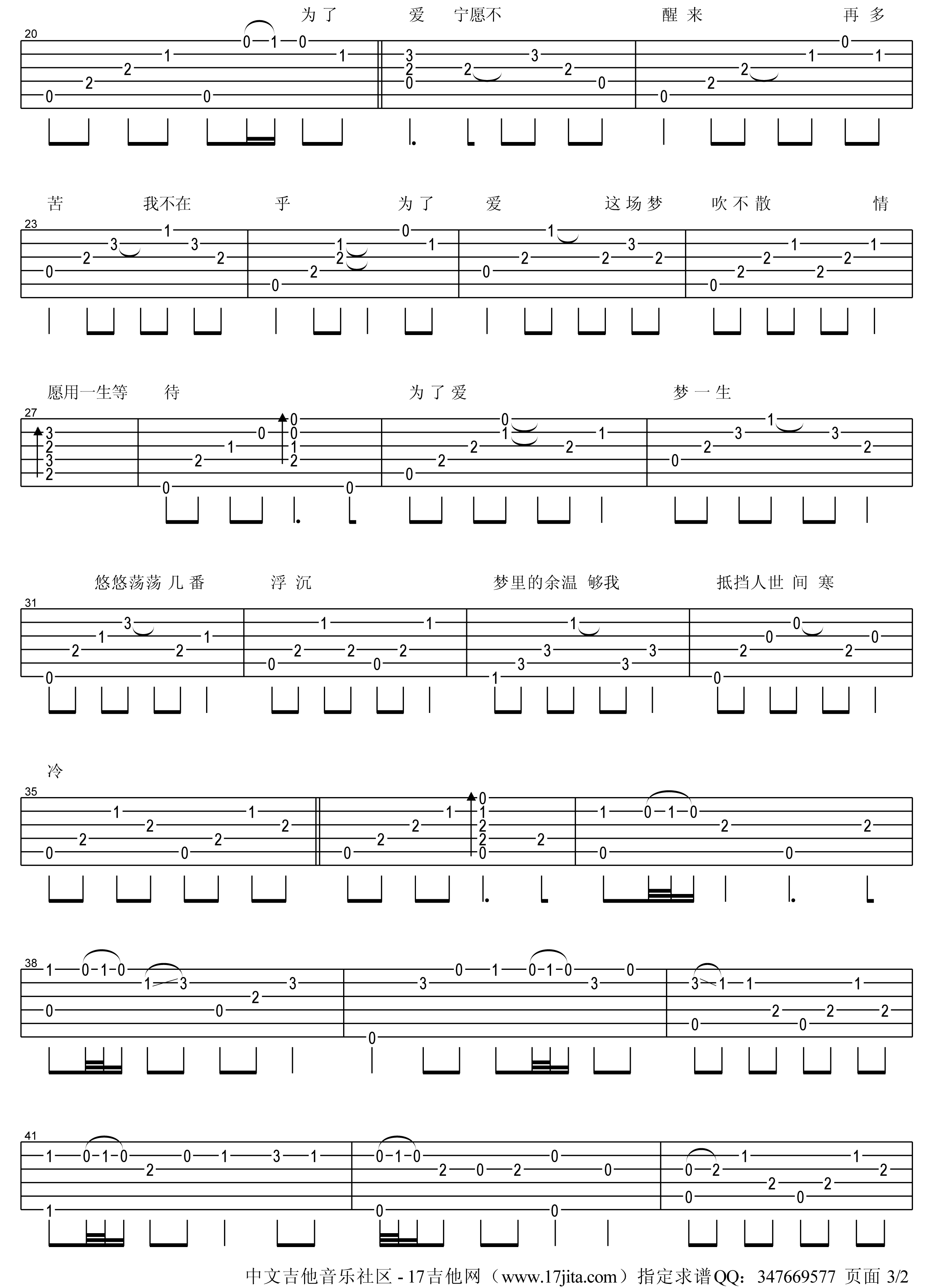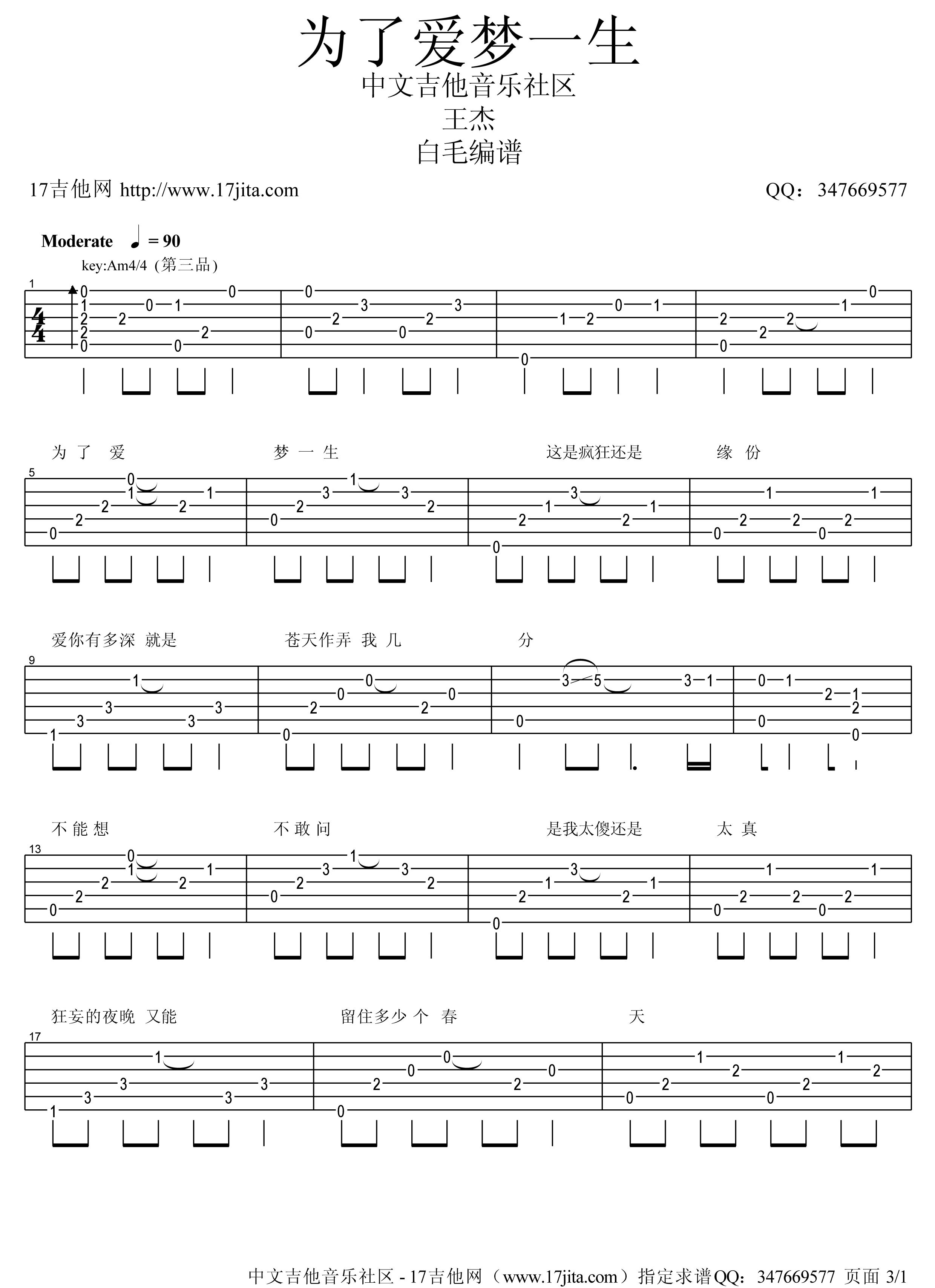 曲谱介绍: 《为了爱梦一生》吉他谱,总共3高清图片谱,选用Am调指法,节拍4/4拍,速度每分钟90BPM,弹唱使用变调夹夹三品,弹唱难度初级。
