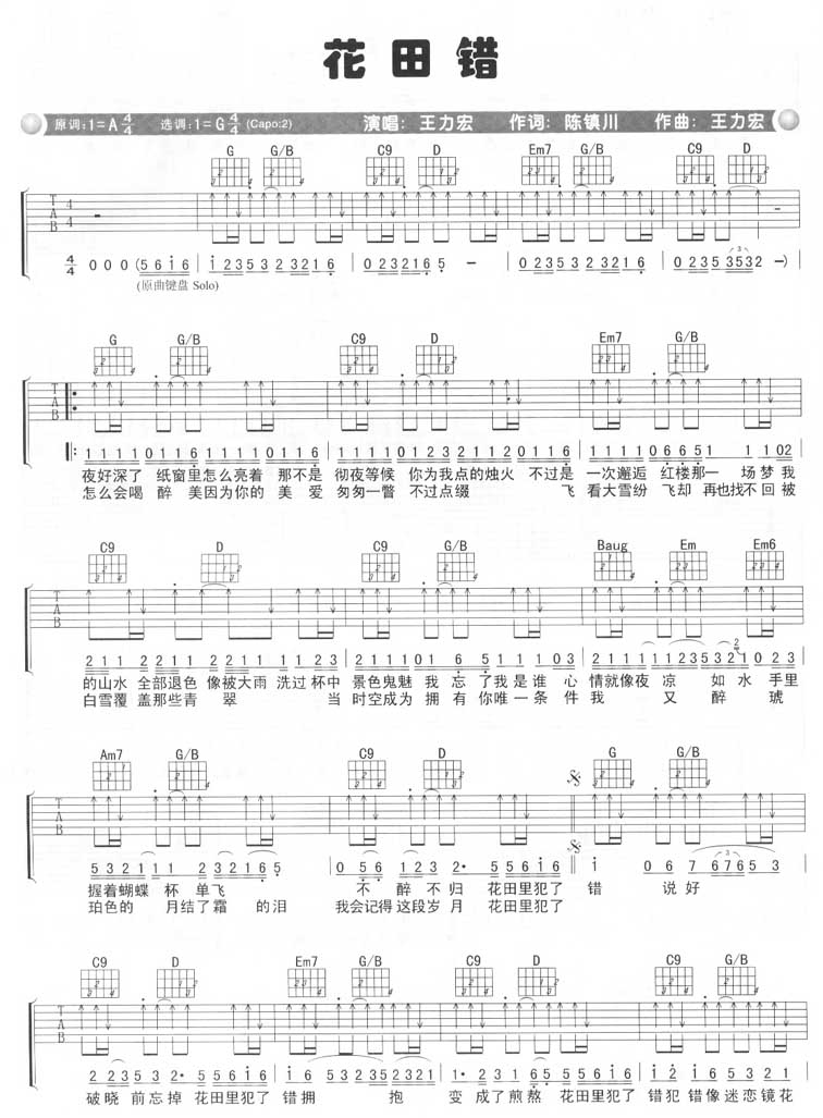曲谱介绍: 《花田错》吉他谱,总共2高清图片谱,原调为A调,选用G调指法,节拍4/4拍,建议使用变调夹夹二品,弹唱难度初级。