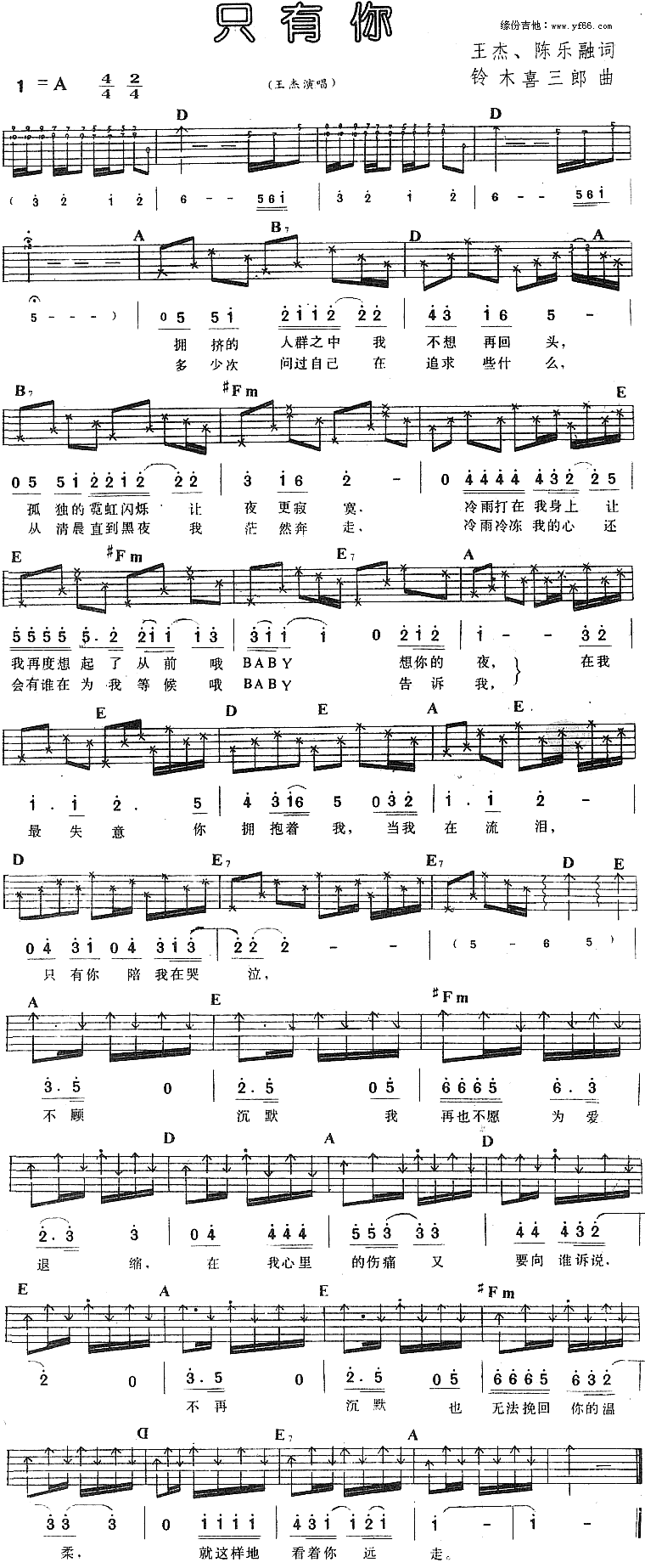曲谱介绍: 《只有你》吉他谱,总共1高清图片谱,选用A调指法,节拍4/4拍和2/4拍,不使用变调夹,弹唱难度初级。