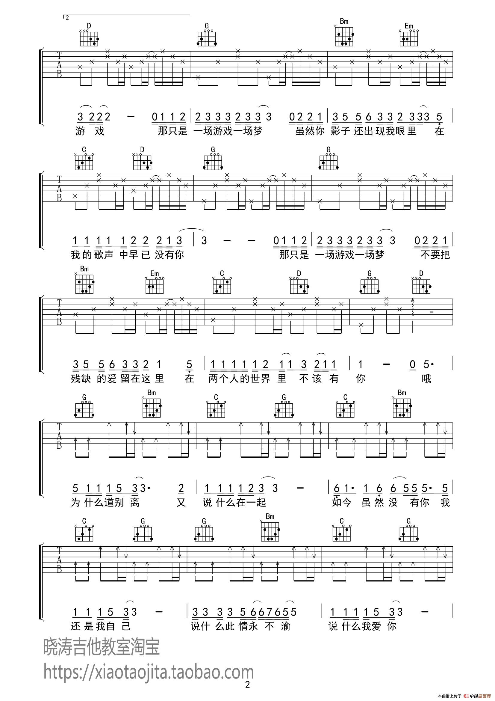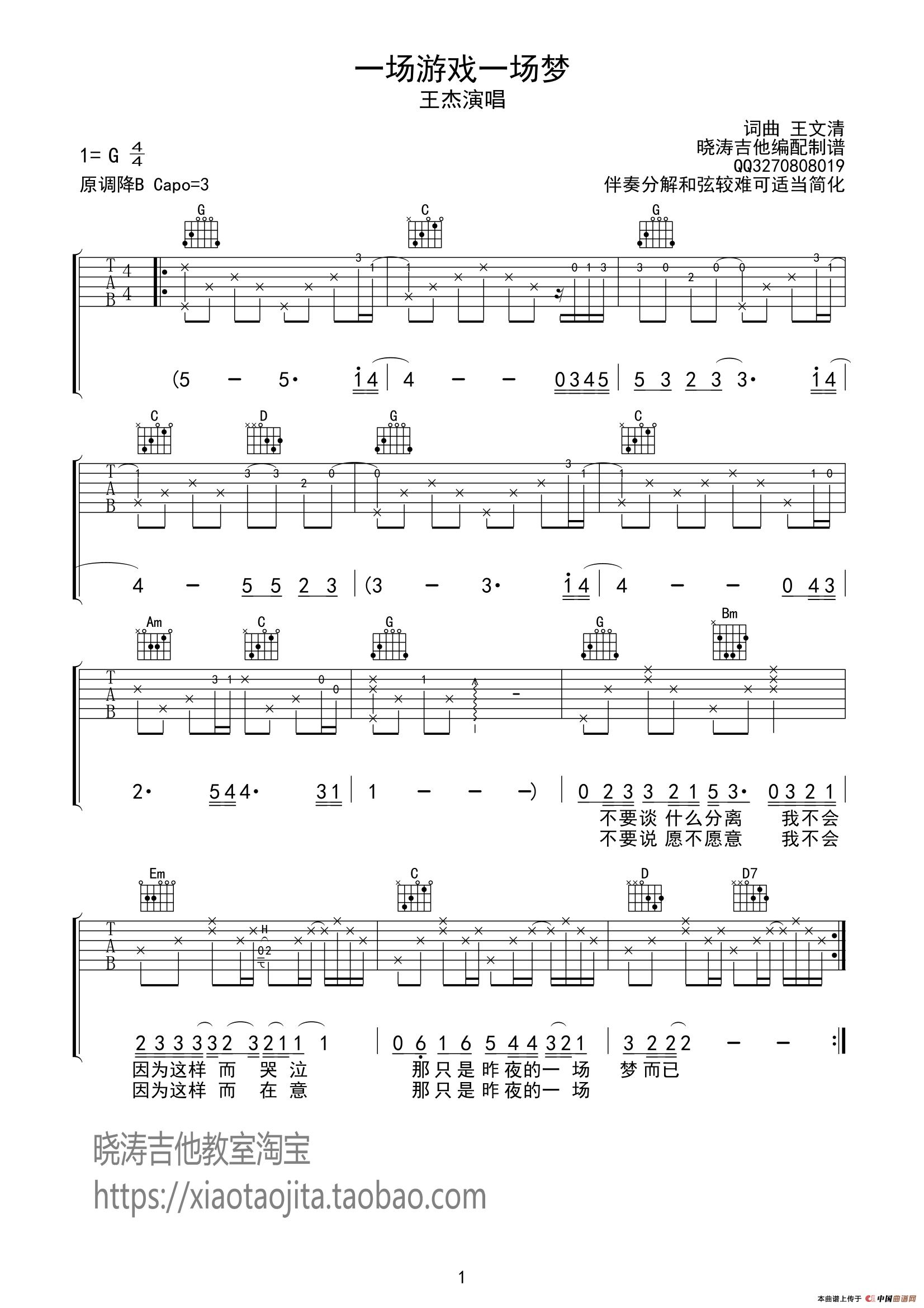 曲谱介绍: 《一场游戏一场梦》吉他谱,总共2高清图片谱,选用G调指法,原调为bB调,节拍4/4拍,变调夹夹3品弹唱,弹唱难度初级。