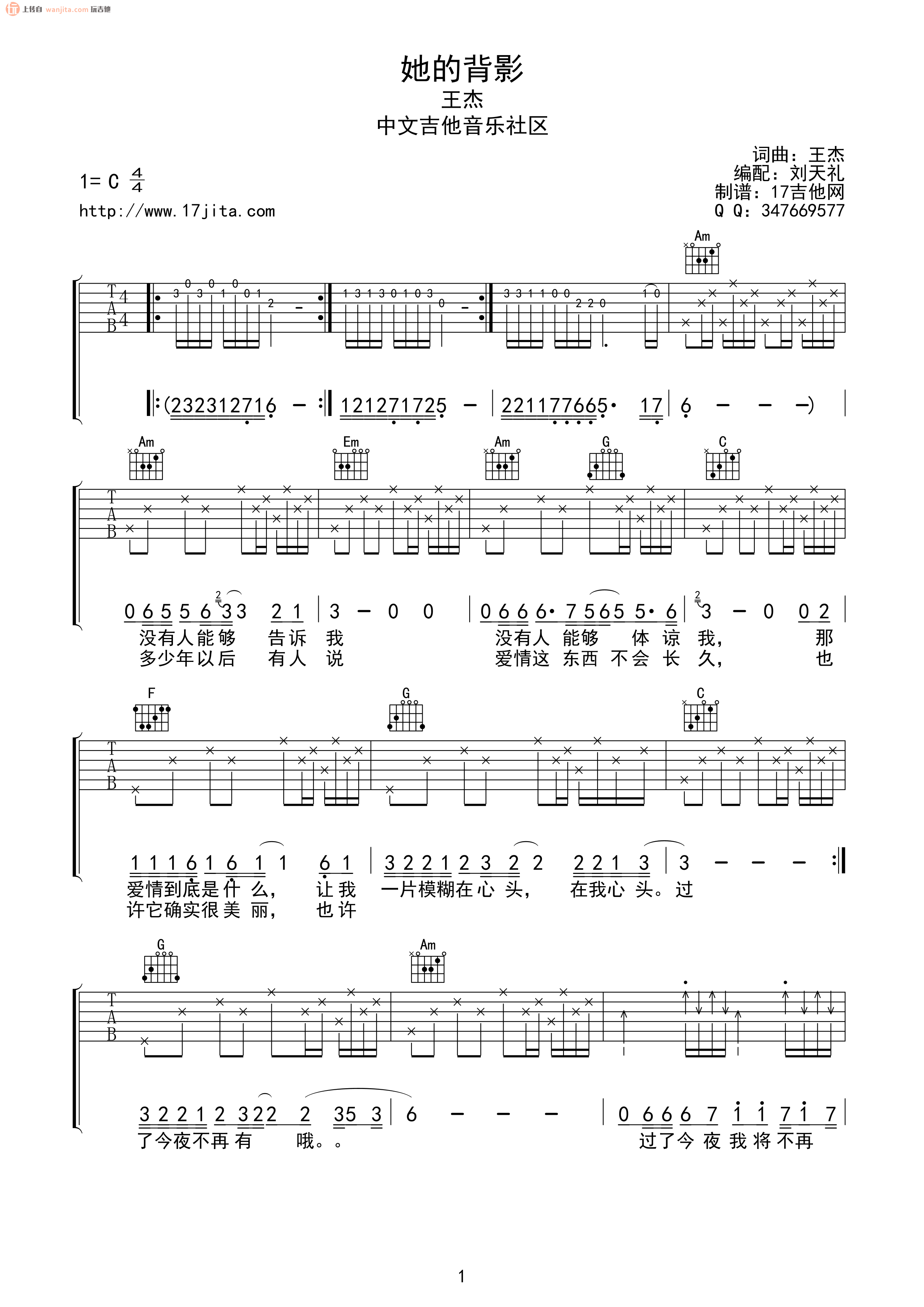 她的背影吉他谱 - 王杰 - C调吉他弹唱谱 - 原版