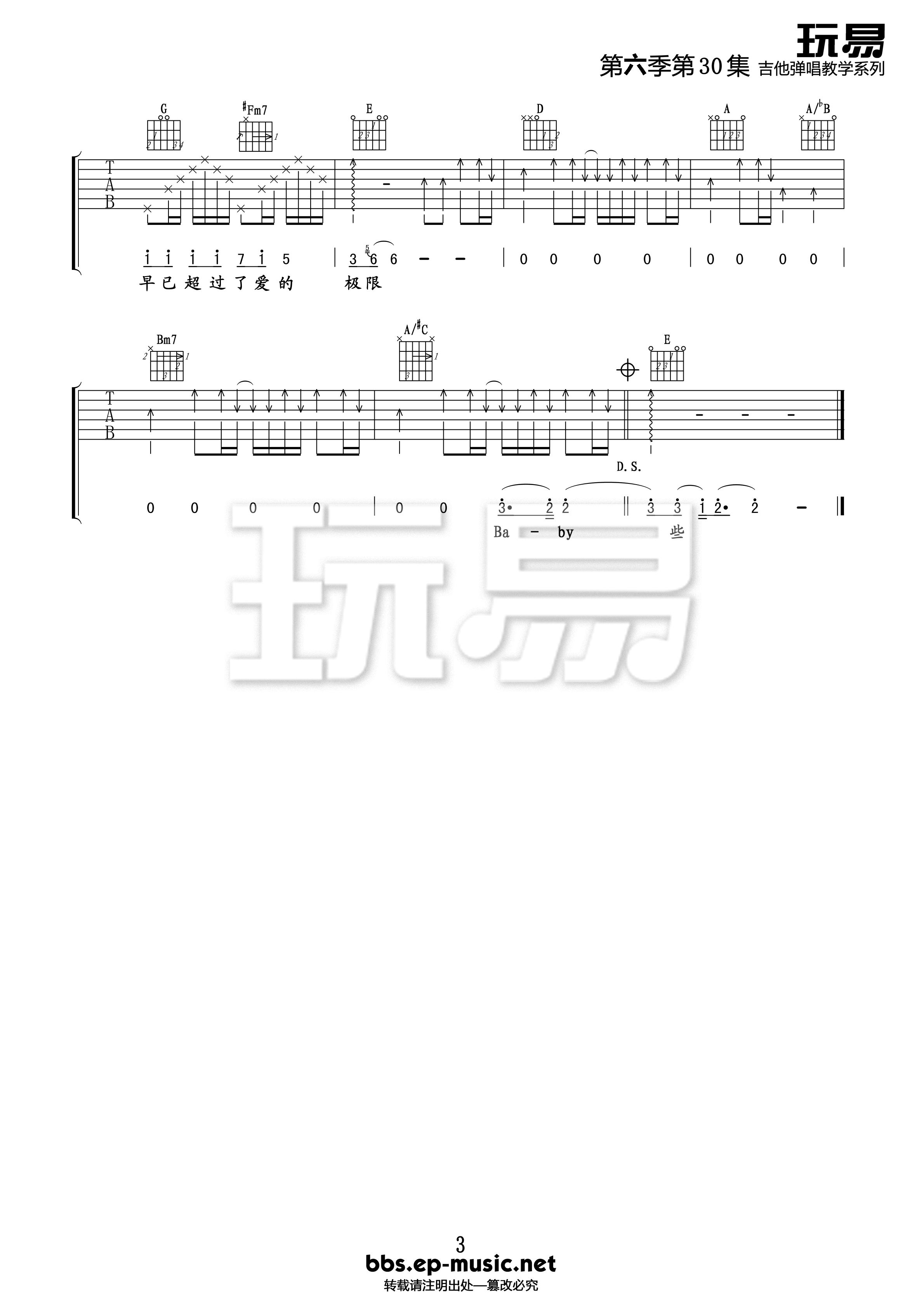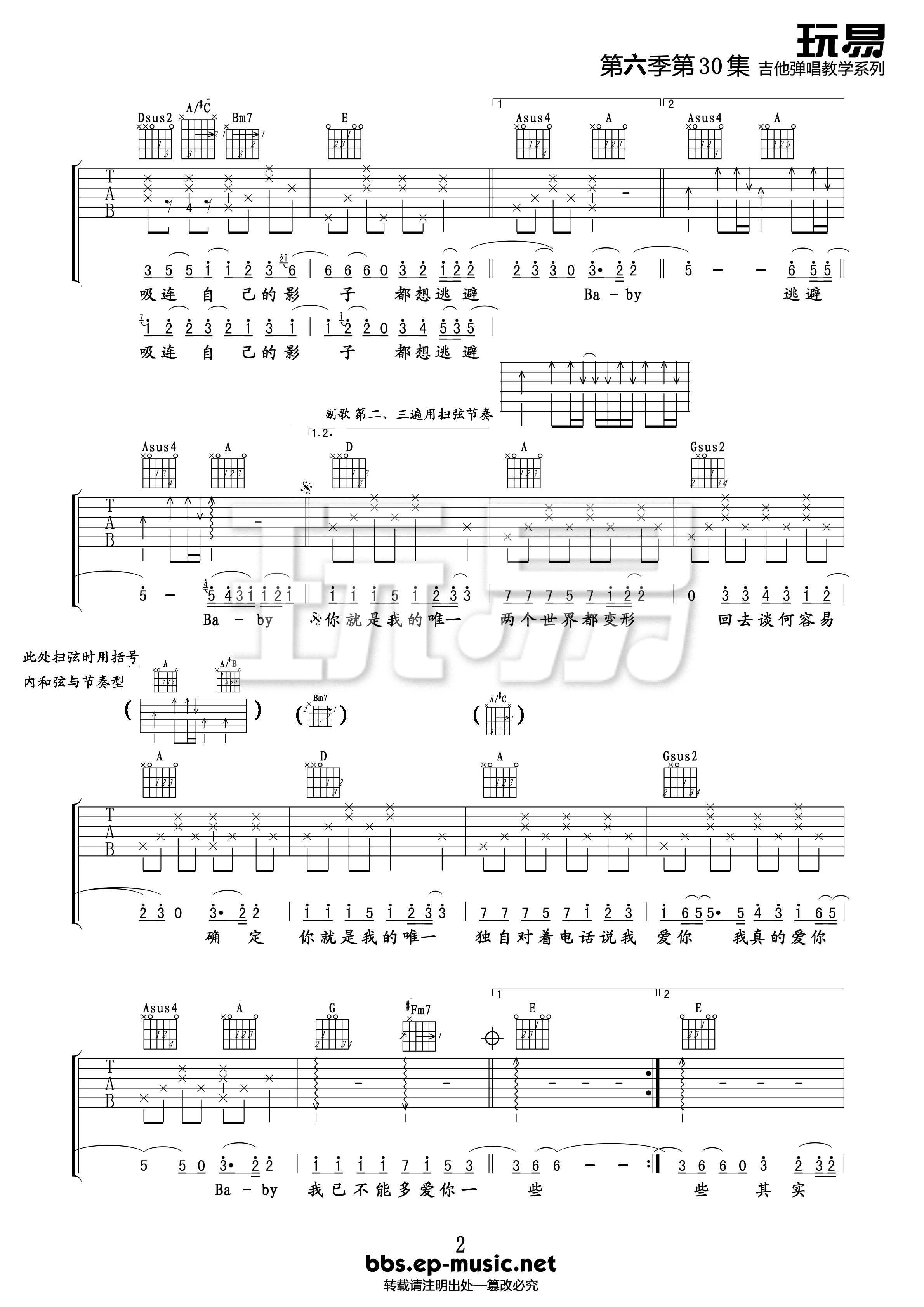曲谱介绍: 王力宏《唯一》吉他谱,总共3高清图片谱,原调为降E调,用D调指法,节拍4/4拍,建议使用变调夹夹1品,弹唱难度初级。