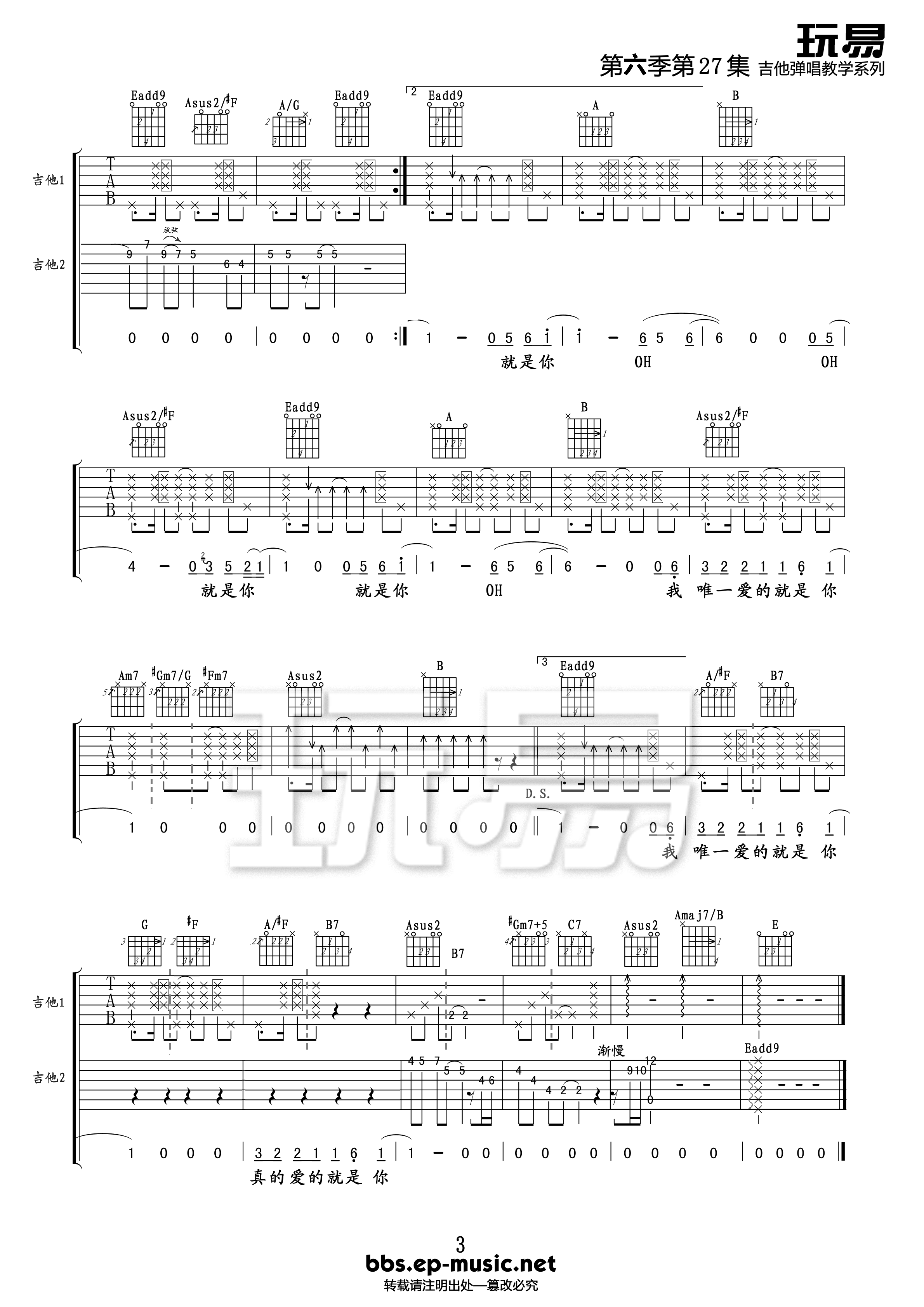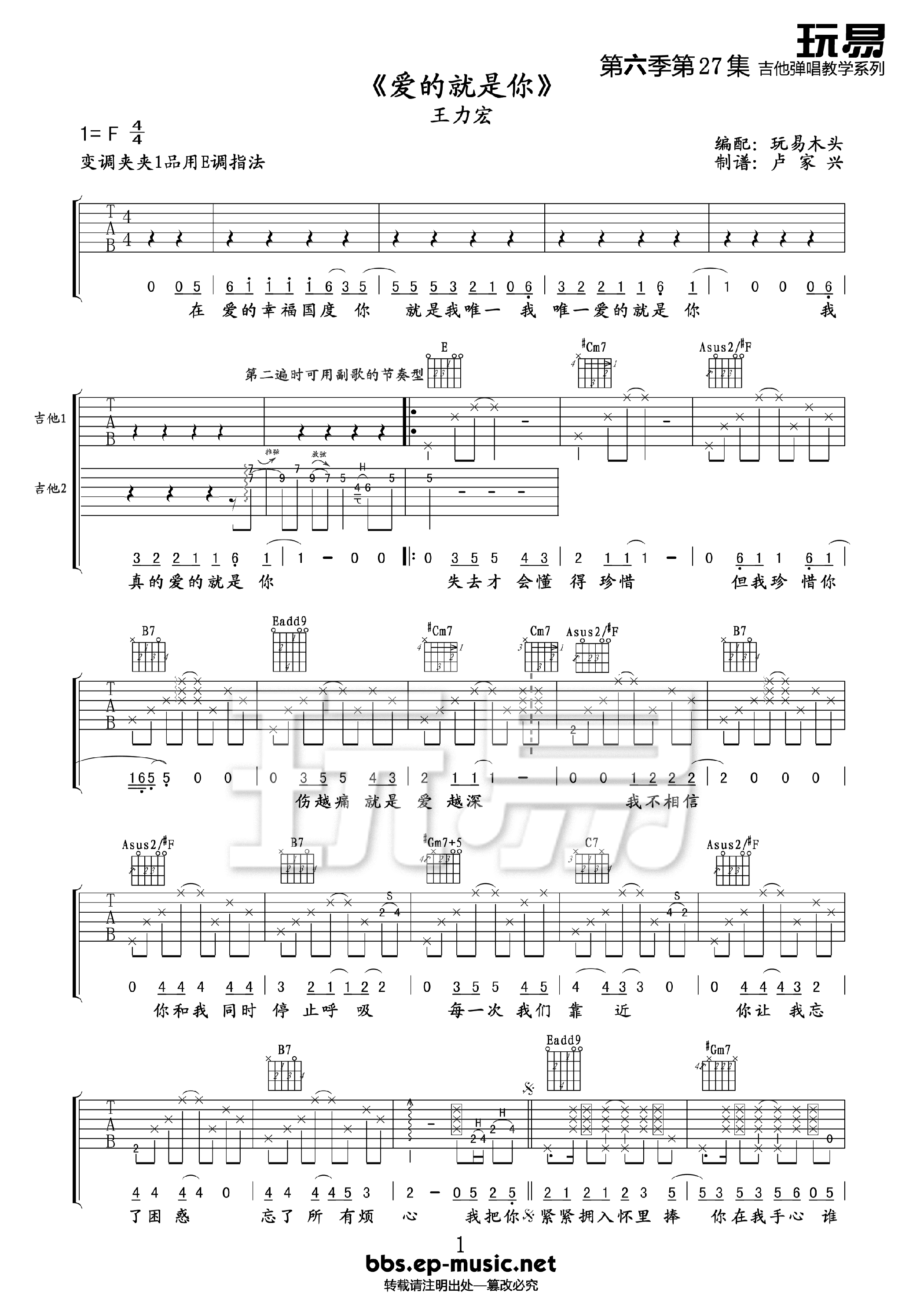 曲谱介绍: 《爱的就是你》吉他谱,总共3高清图片谱,原调为F调,用E调指法,节拍4/4拍,建议使用变调夹夹1品,弹唱难度初级。