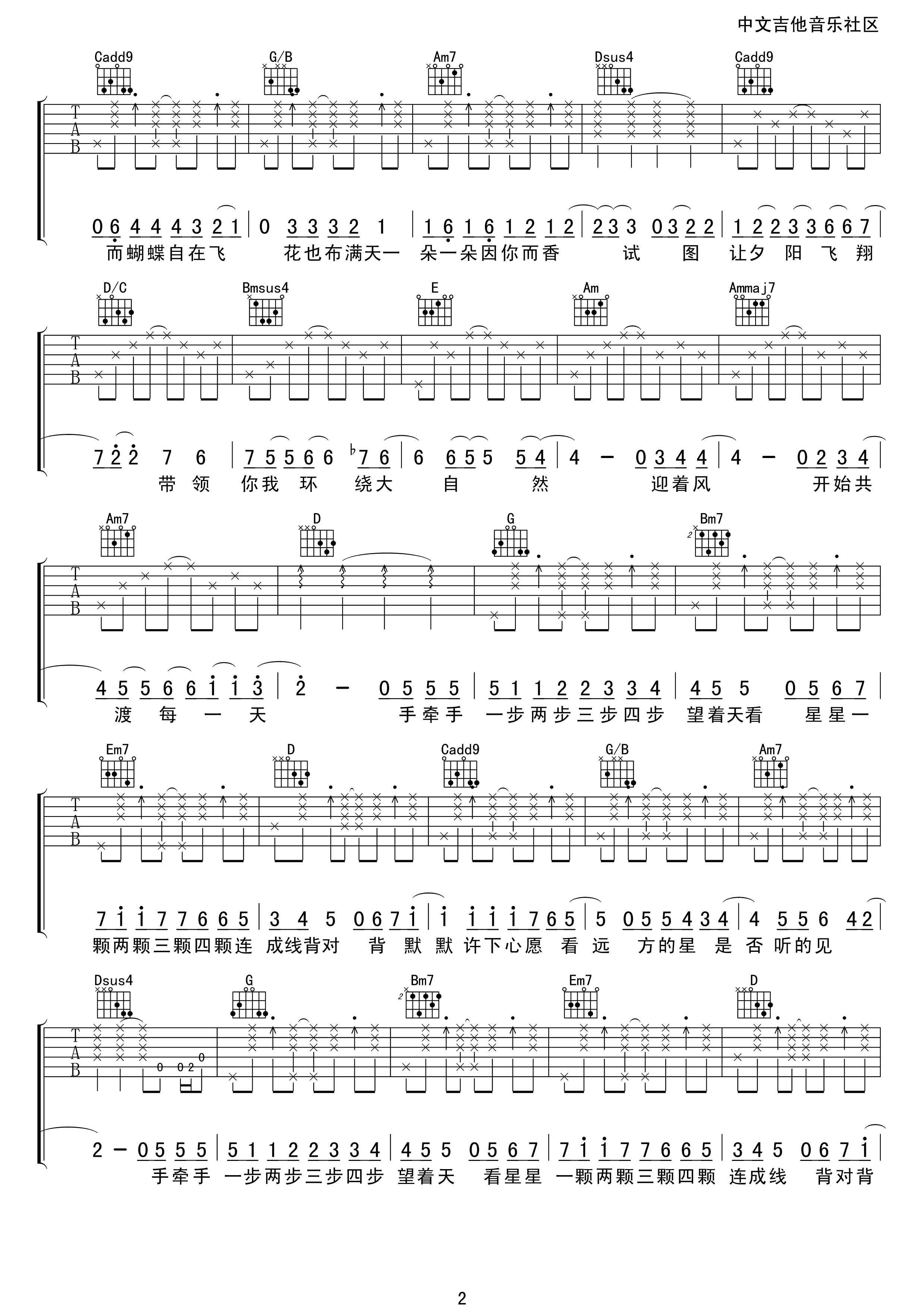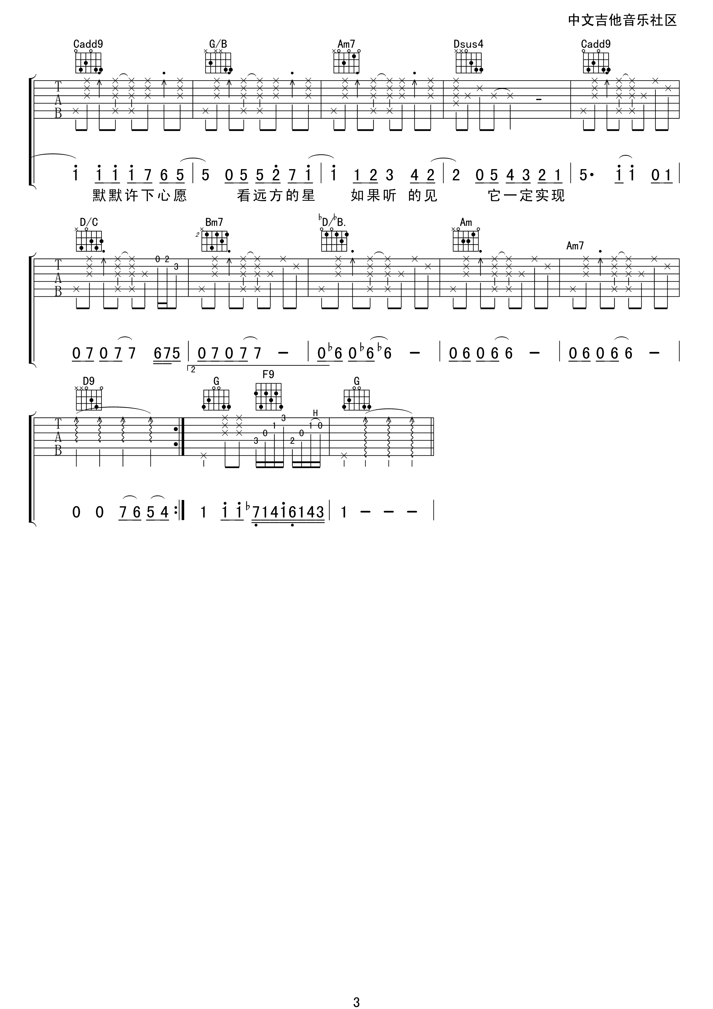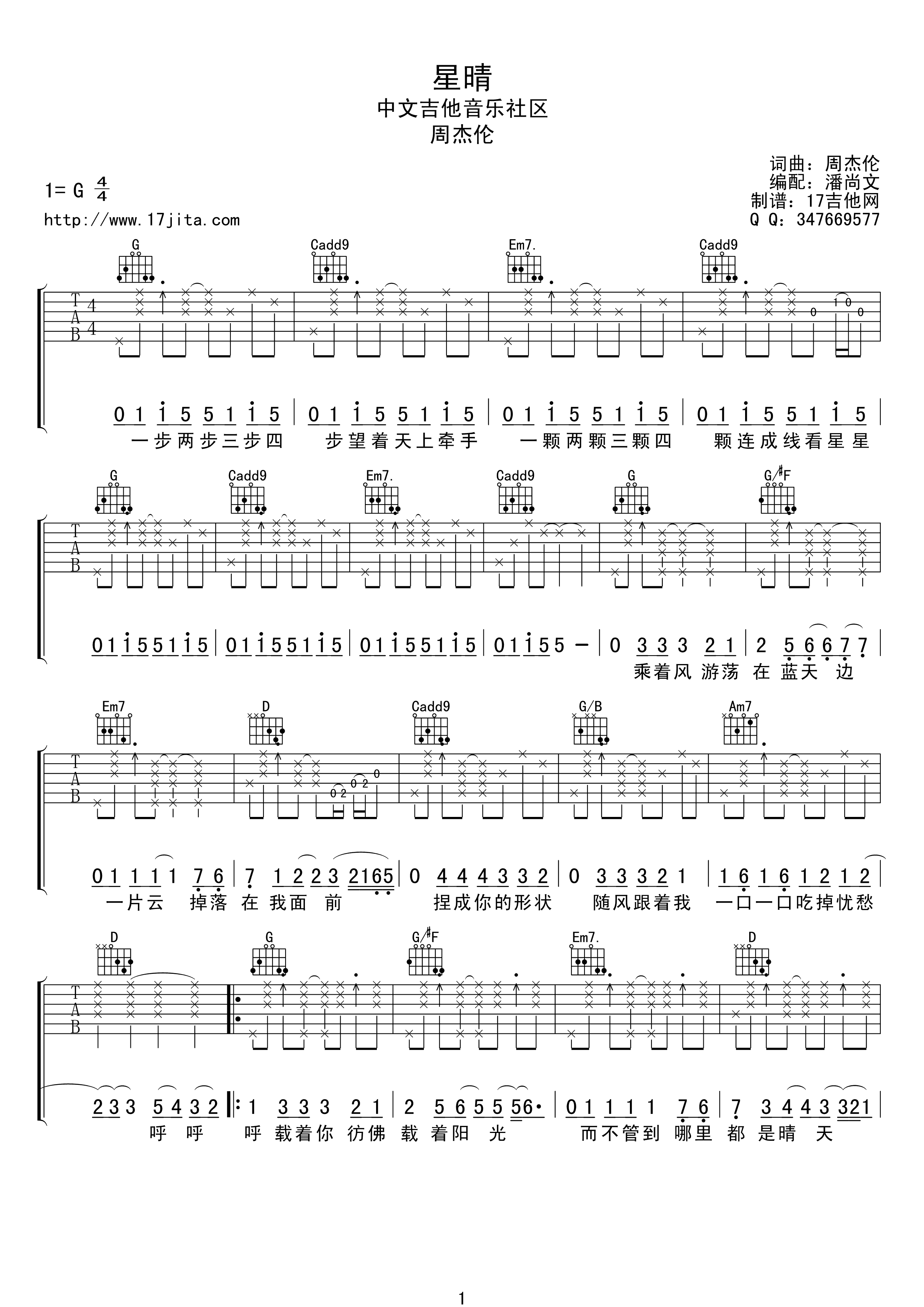 曲谱介绍: 周杰伦《星晴》吉他谱,总共3高清图片谱,用G调指法,节拍4/4拍,不使用变调夹,弹唱难度初级。