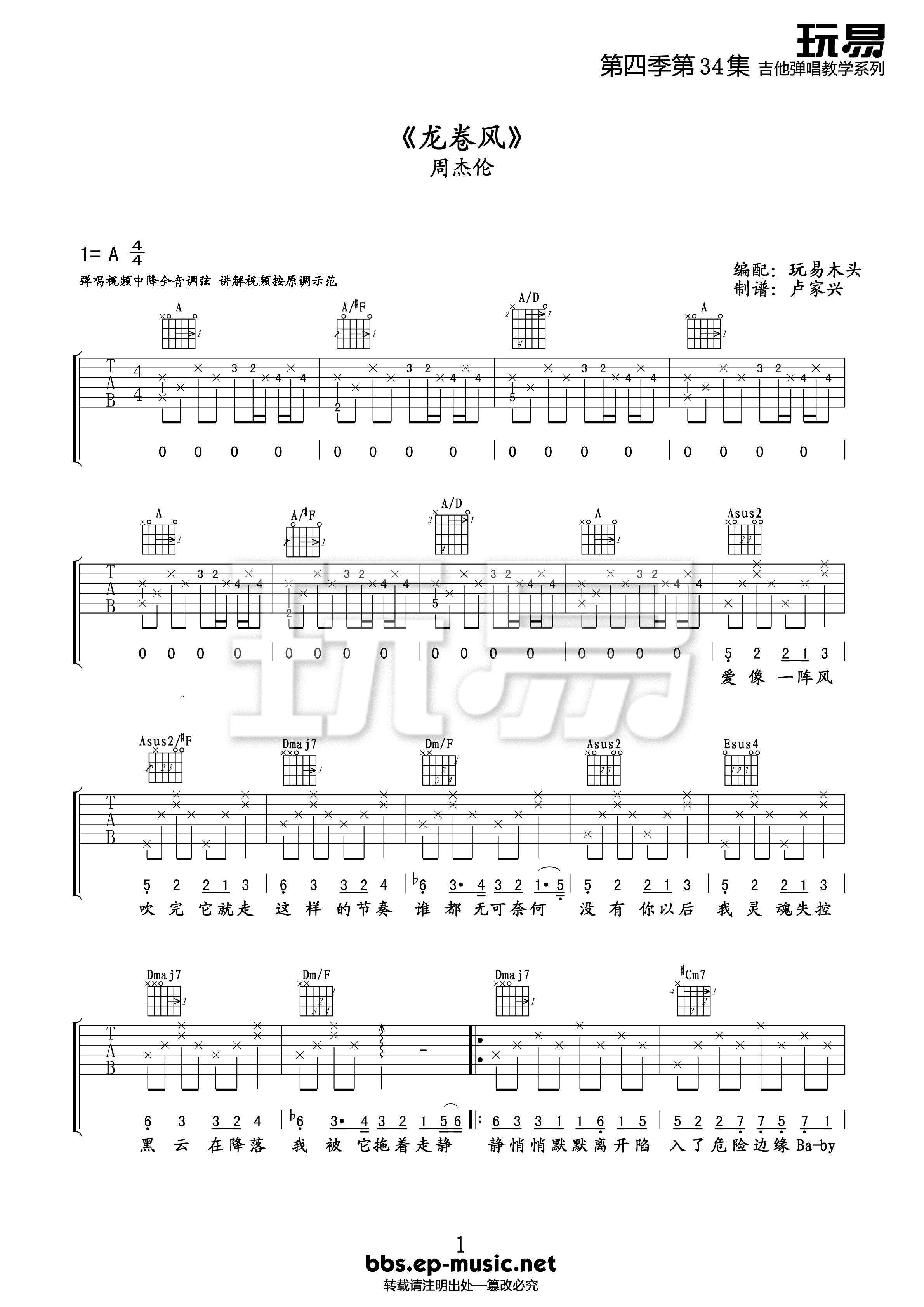 曲谱介绍: 由@卢家兴编配制谱《龙卷风》吉他谱,总共3高清图片谱,选用A调指法,节拍4/4拍,降半音调弦,不使用变调夹,弹唱难度初级。