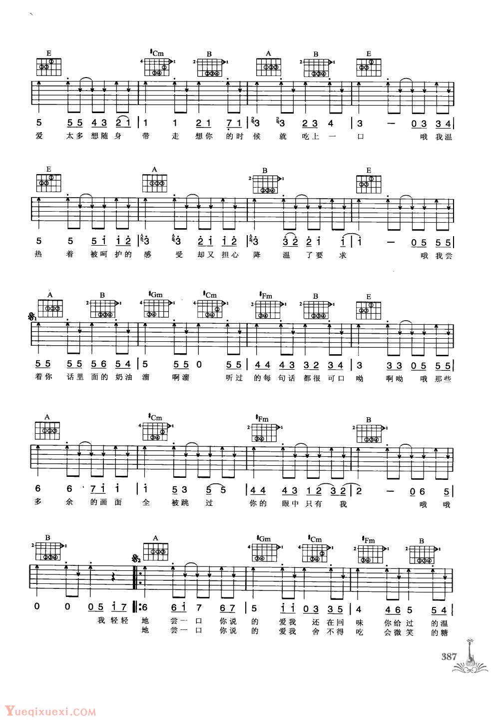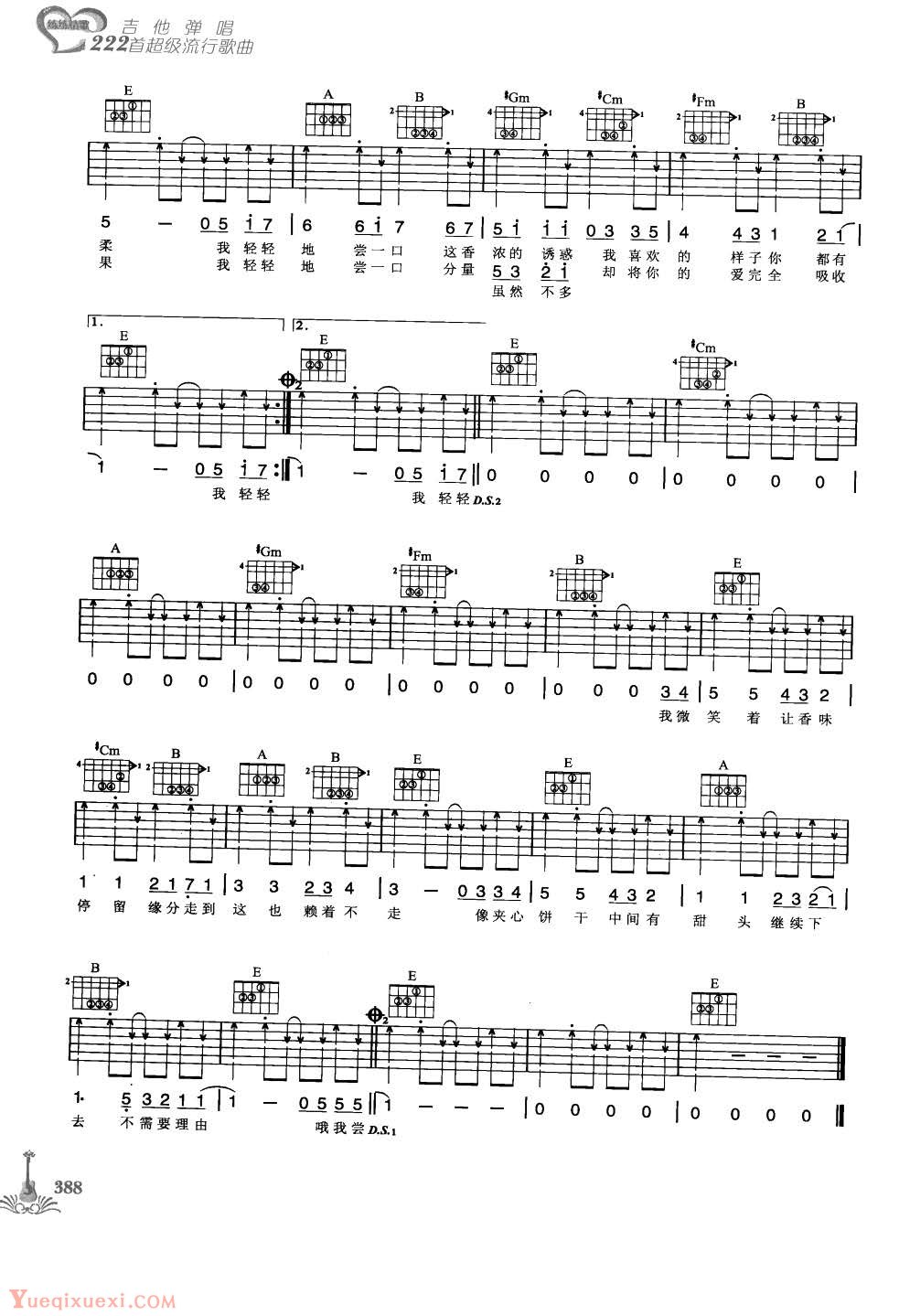 曲谱介绍: 《甜甜的》吉他谱,总共3高清图片谱,选用E调指法,节拍4/4拍,不使用变调夹,弹唱难度初级。