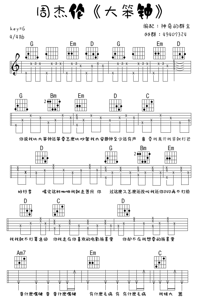 曲谱介绍: 周杰伦《大笨钟》吉他弹唱谱,采用G调指法编配,共有2张高清图谱,免翻页排版设计。