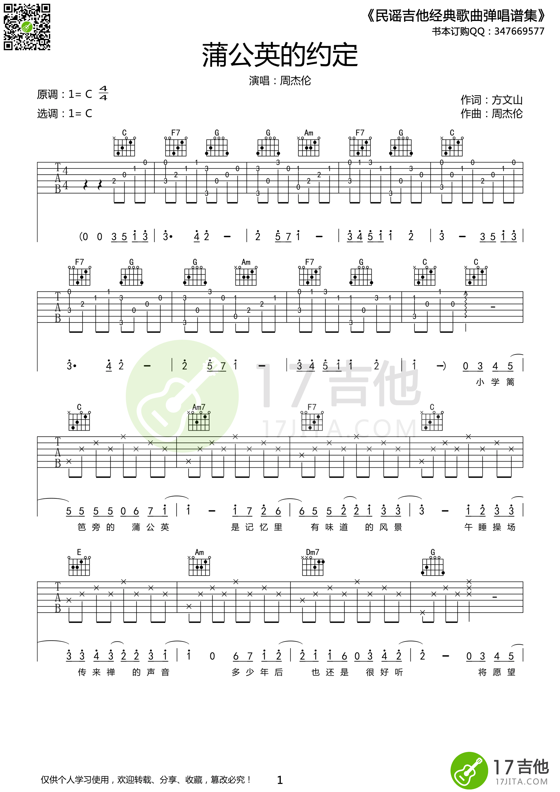 曲谱介绍: 《蒲公英的约定》吉他谱,总共3高清图片谱,原调为C调,选用C调指法,节拍4/4拍,不使用变调夹,弹唱难度初级。