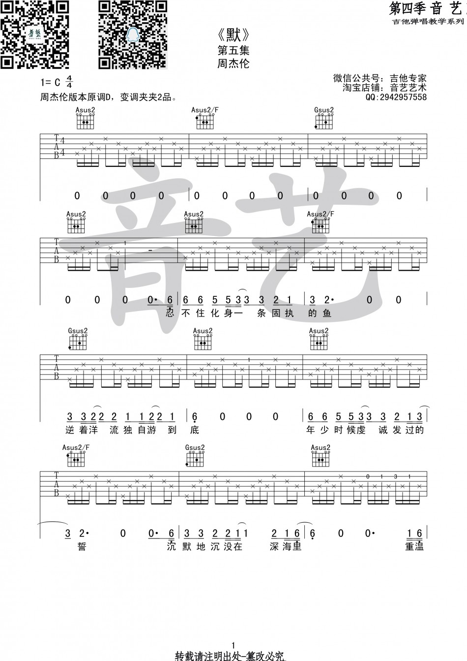 曲谱介绍: 周杰伦《默》吉他谱,总共3高清图片谱,原调为D调,选用C调指法,节拍4/4拍,建议使用变调夹夹2品,弹唱难度初级。