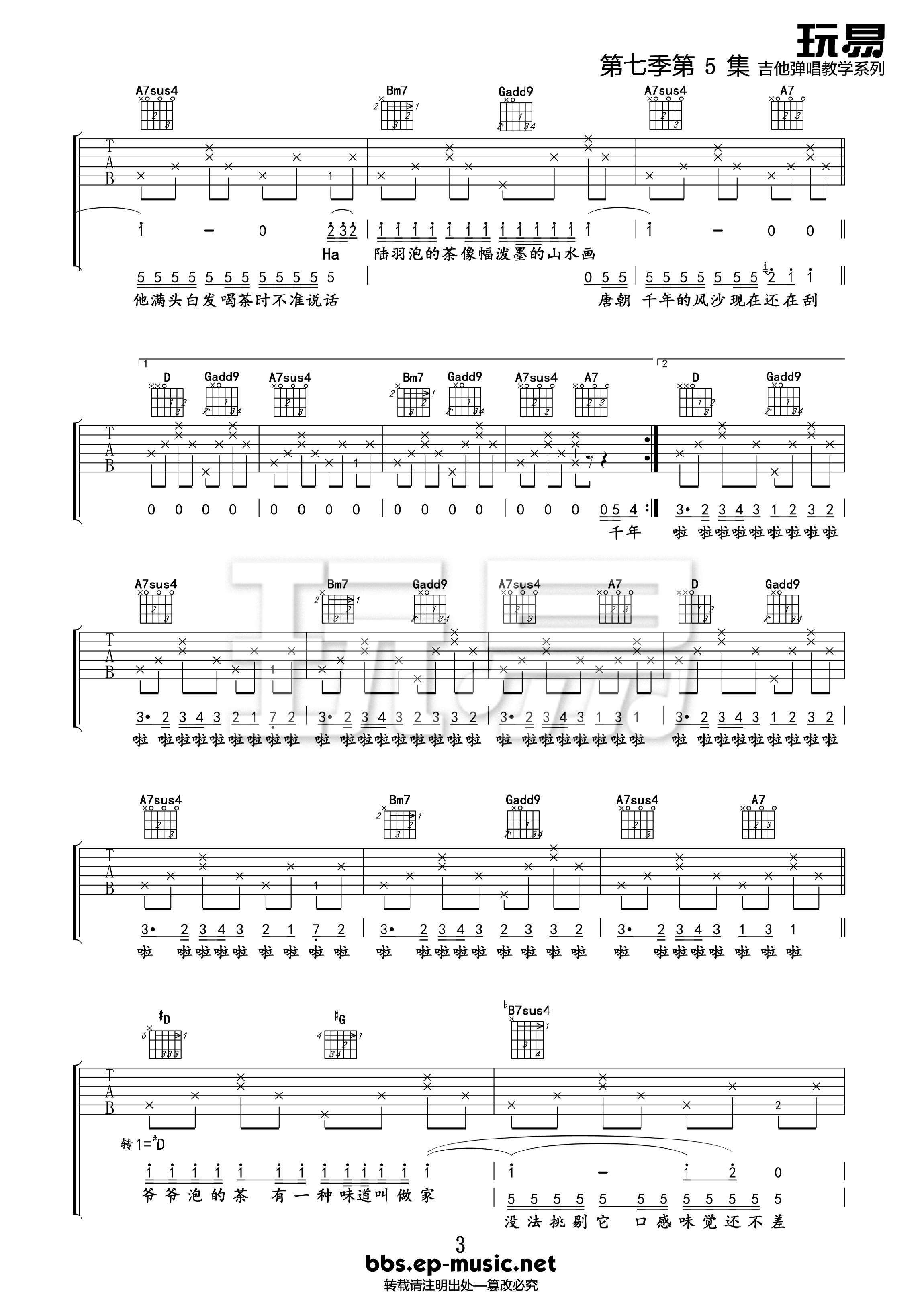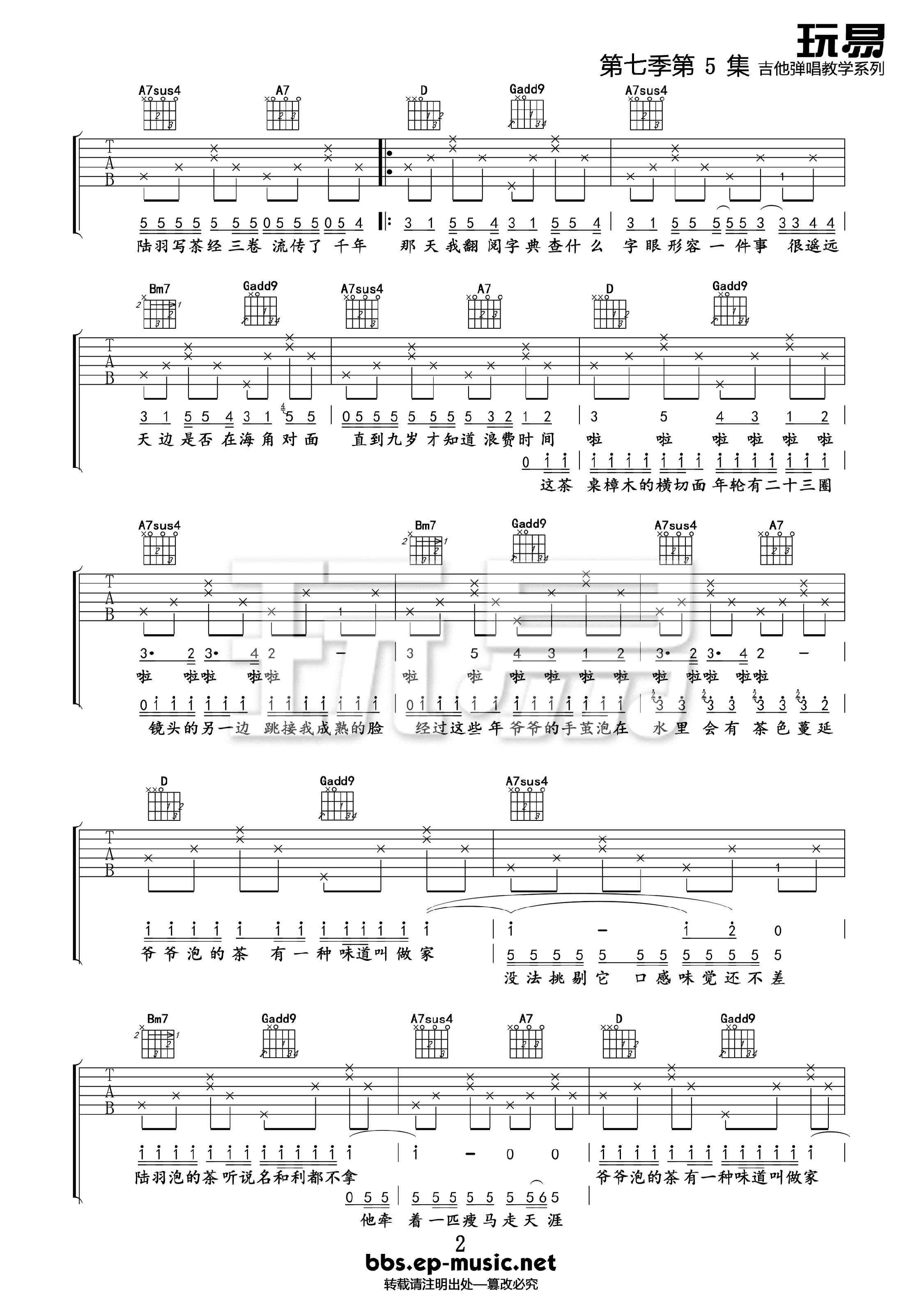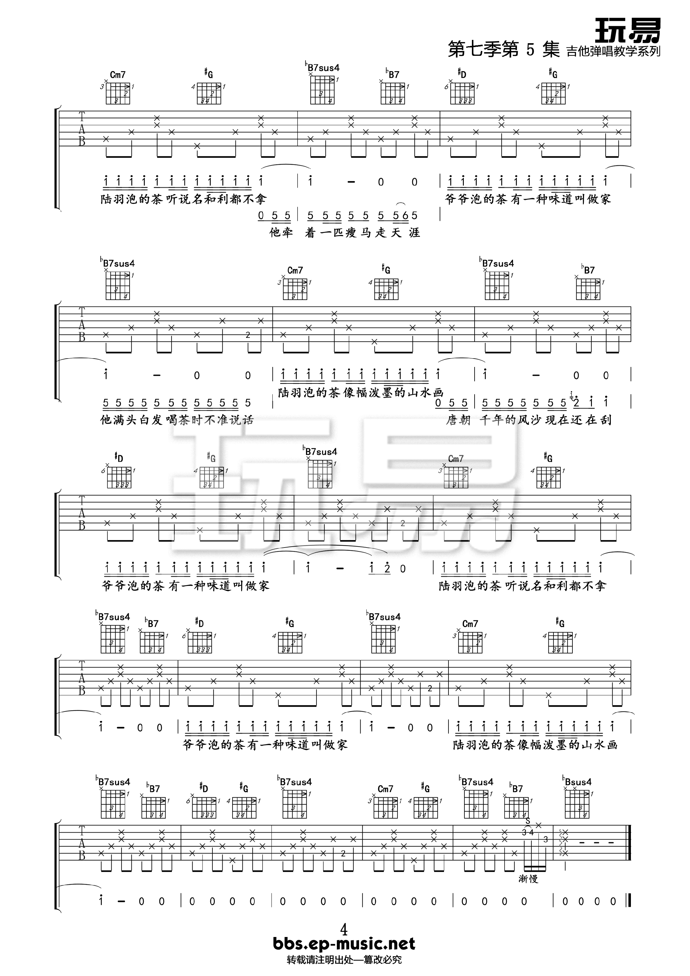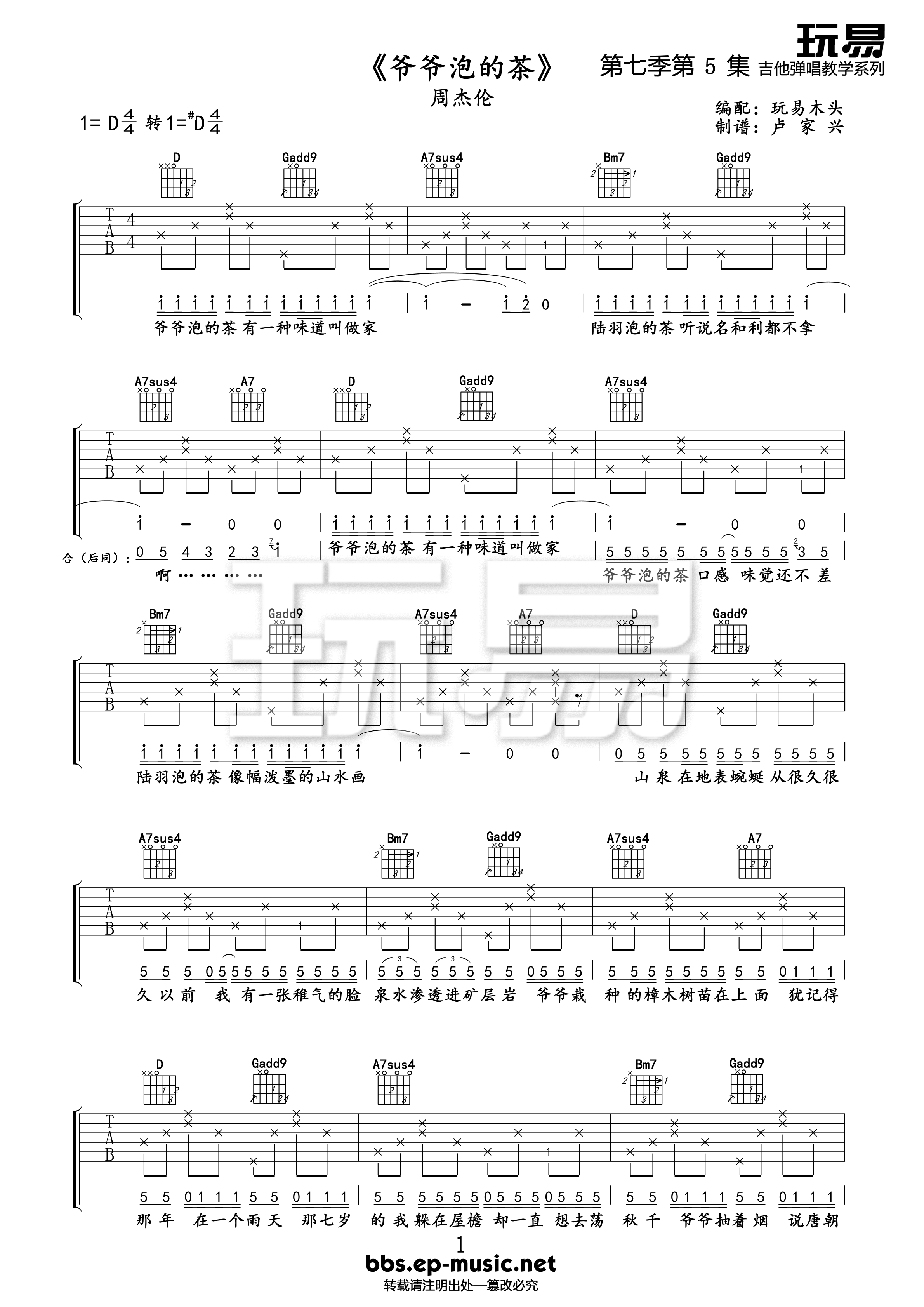 曲谱介绍: 《爷爷泡的茶》吉他谱,总共4高清图片谱,选用D调指法转升D调,节拍4/4拍,不使用变调夹,弹唱难度初级。
