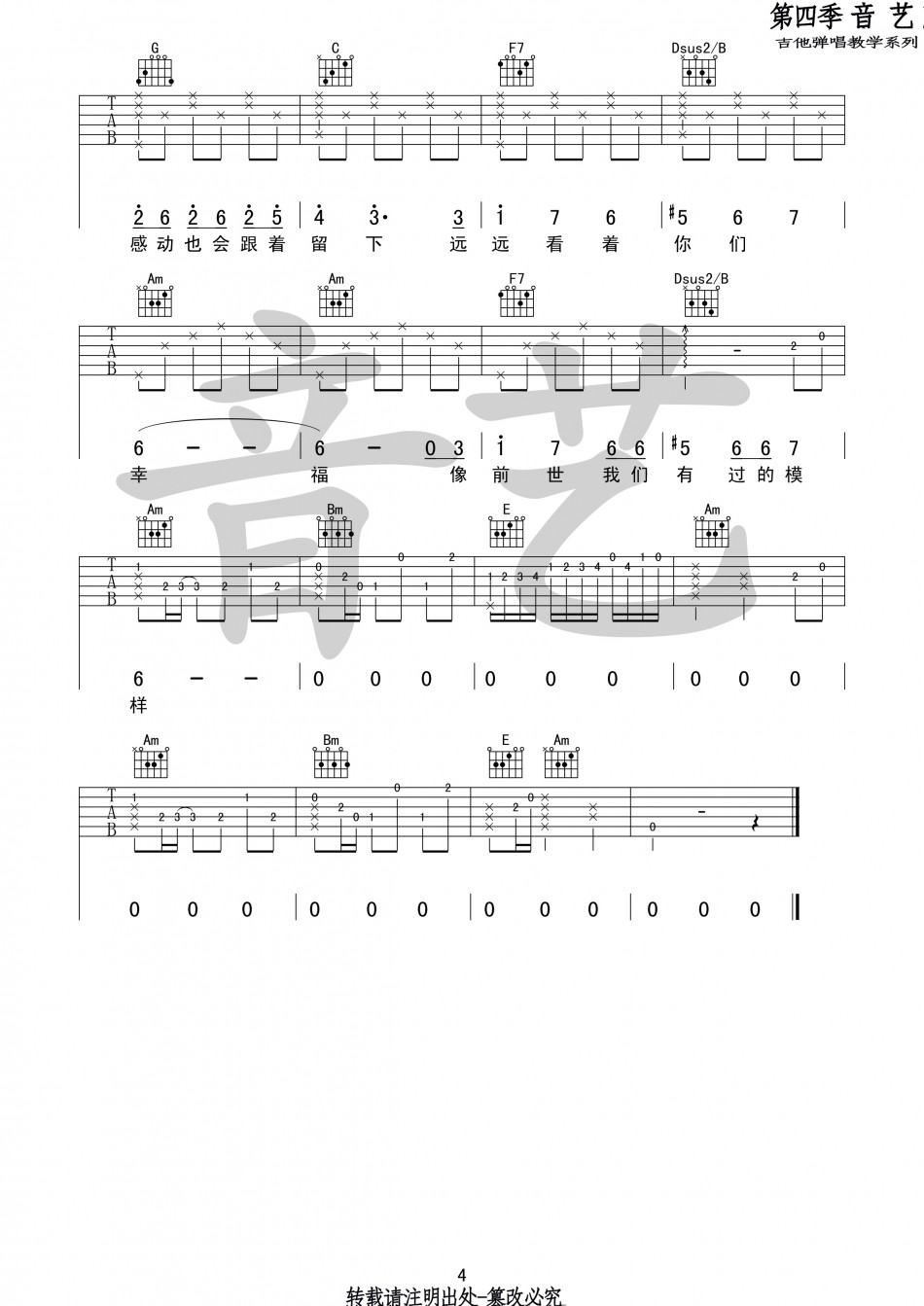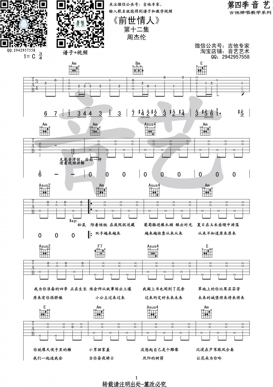 曲谱介绍: 《前世情人》吉他谱,总共4张高清图片谱,选用C调指法,节拍3/4拍,不使用变调夹,弹唱难度初级。