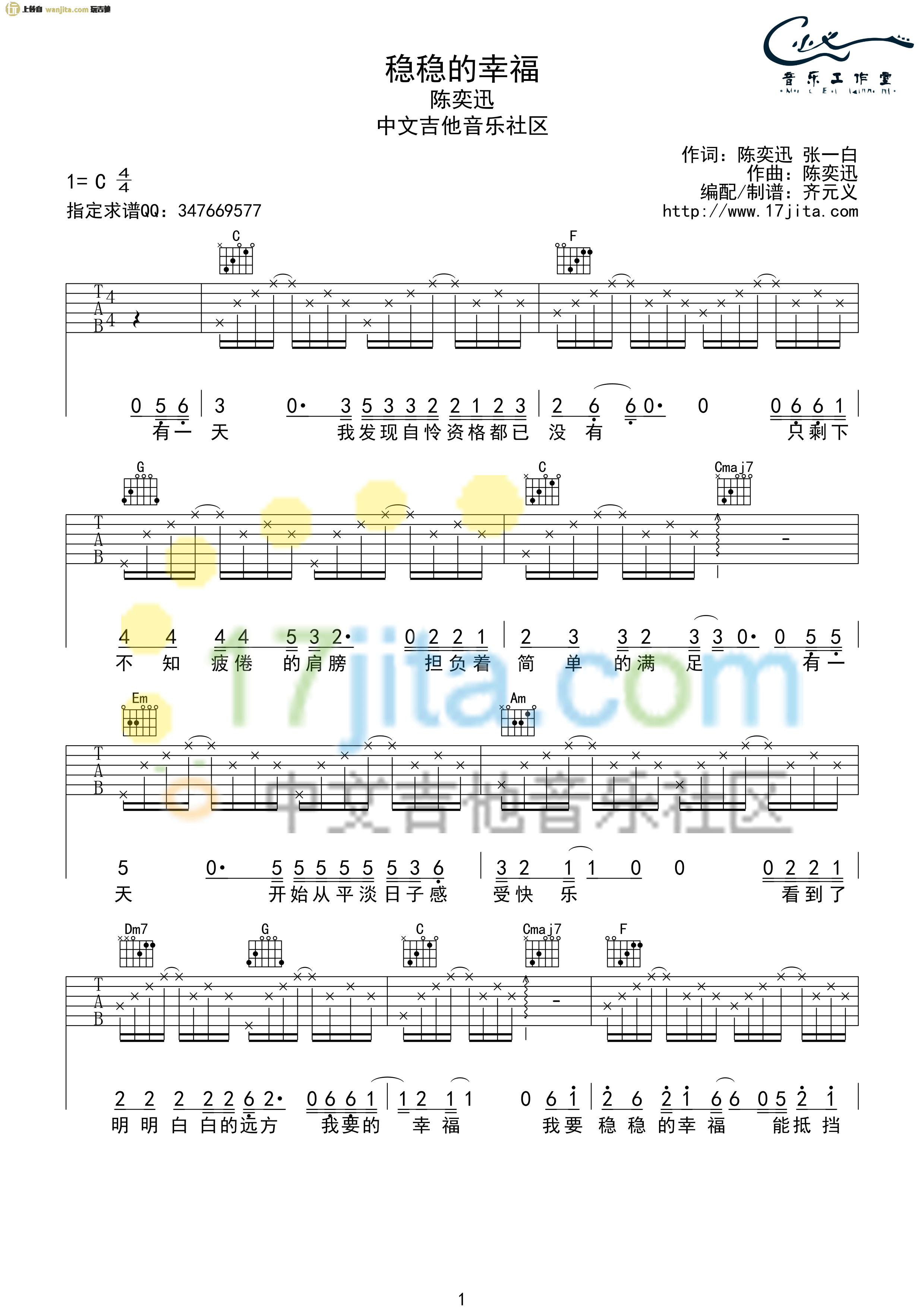 曲谱介绍: 稳稳的幸福吉他谱,总共3张高清图片谱,选用C调编配,标准调音,可不用变调夹,节拍4/4拍,弹唱难度较为简单,主要以标准分解和弦弹唱,比较适合初中级水平的练习弹唱。
