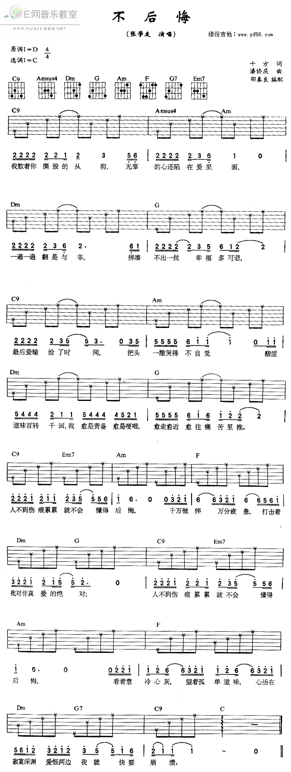 不后悔吉他谱 - 张学友 - C调吉他弹唱谱