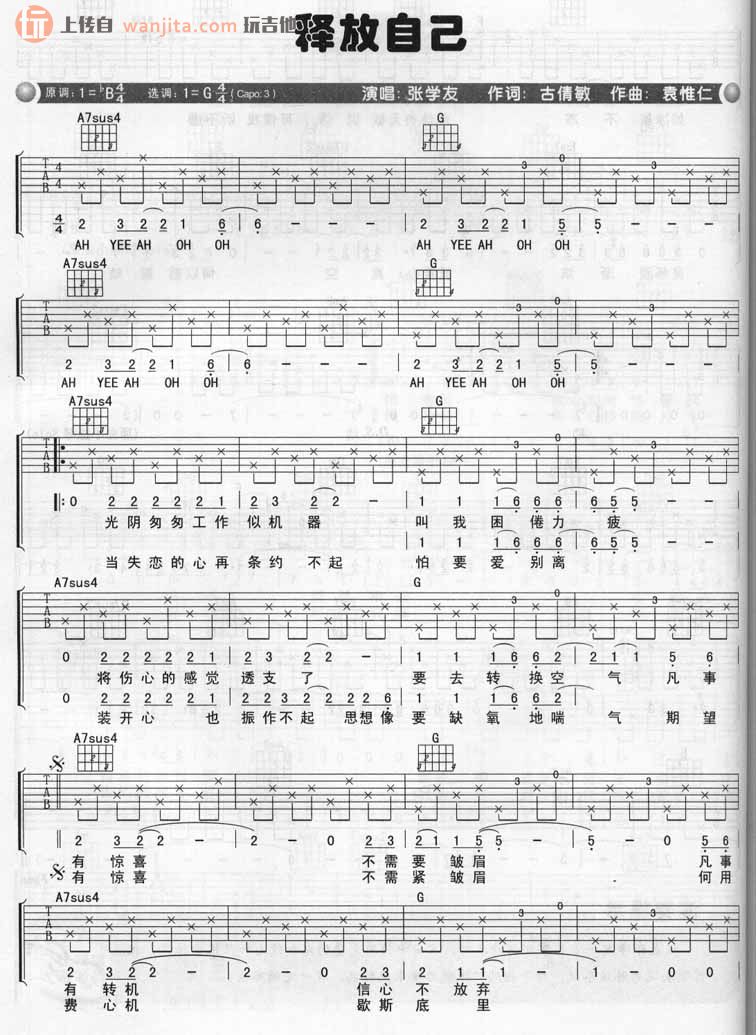 释放自己吉他谱 - 张学友 - G调吉他弹唱谱