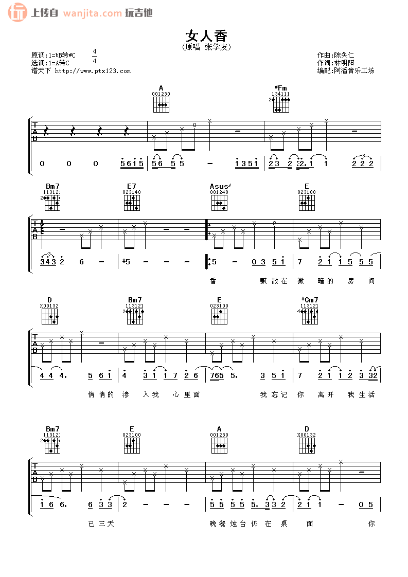 曲谱介绍: 《女人香》吉他谱,总共3张高清图片谱,原调为降B调转升C调,选用A调转C调,节拍4/4拍,不使用变调夹,弹唱难度初级。