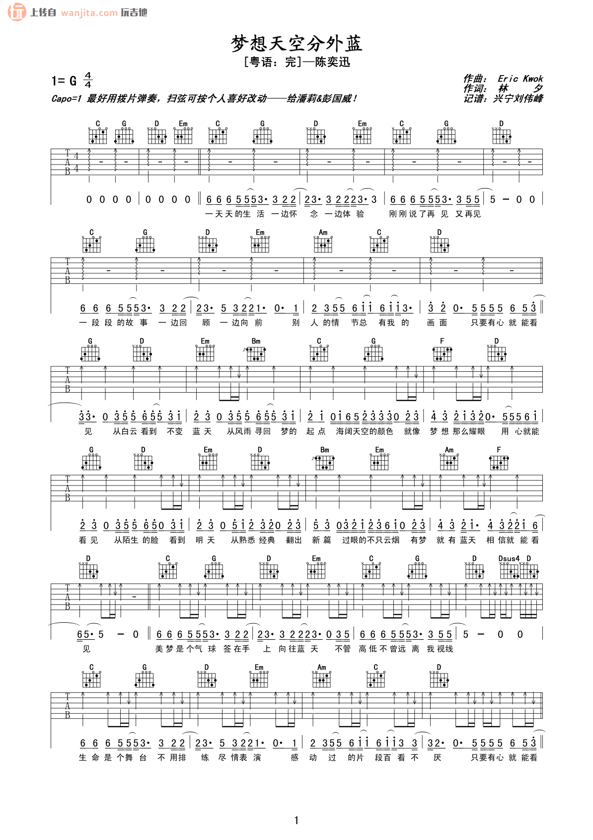 梦想天空分外蓝吉他谱 - 陈奕迅 - G调吉他弹唱谱