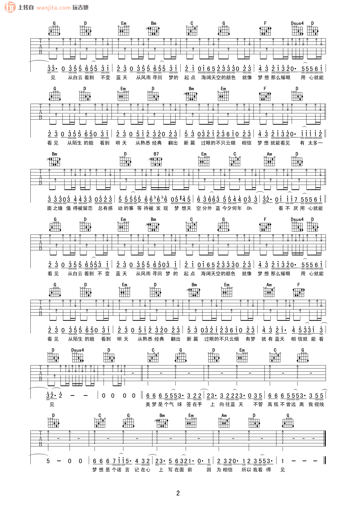 曲谱介绍: 《梦想天空分外蓝》吉他谱,总共2张高清图片谱,原调为G调,节拍4/4拍,建议使用变调夹夹1品,弹唱难度初级。