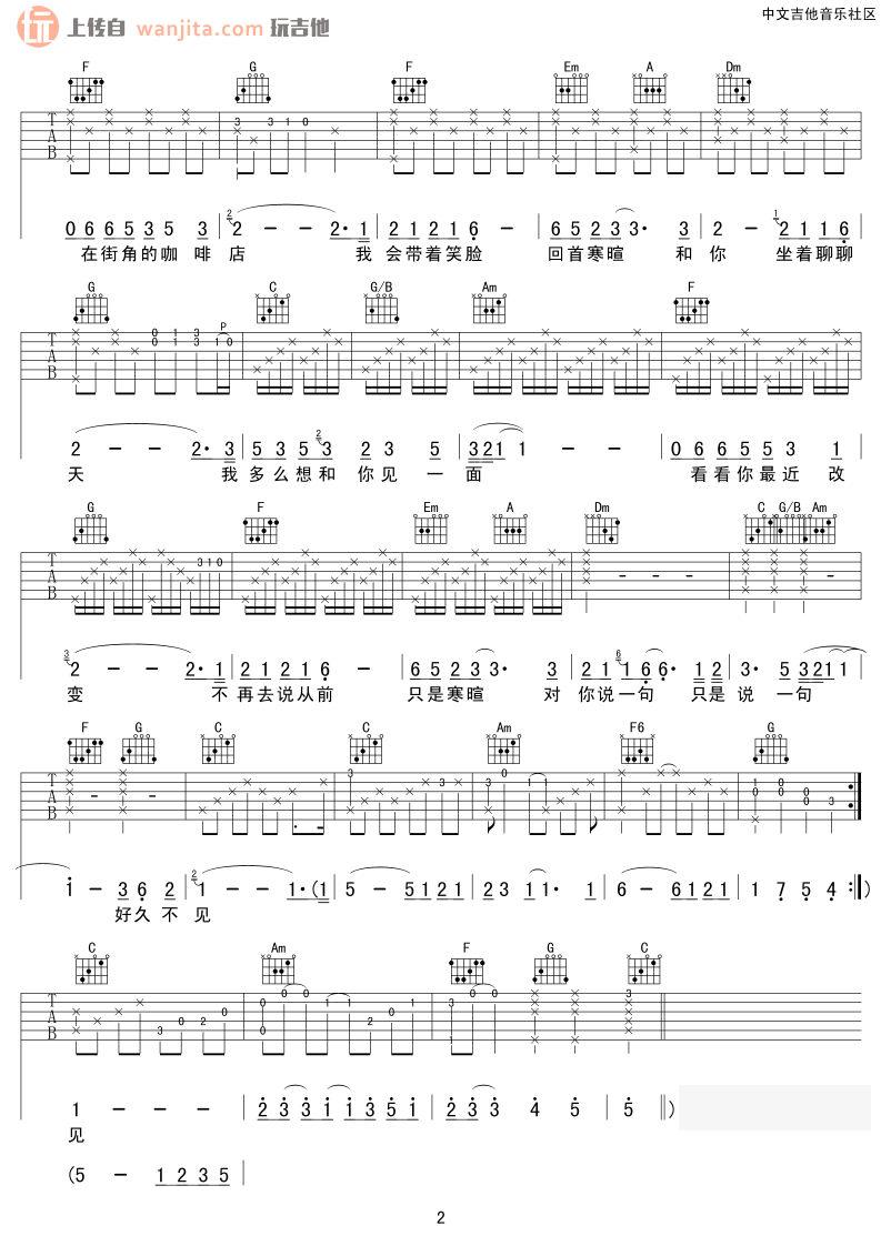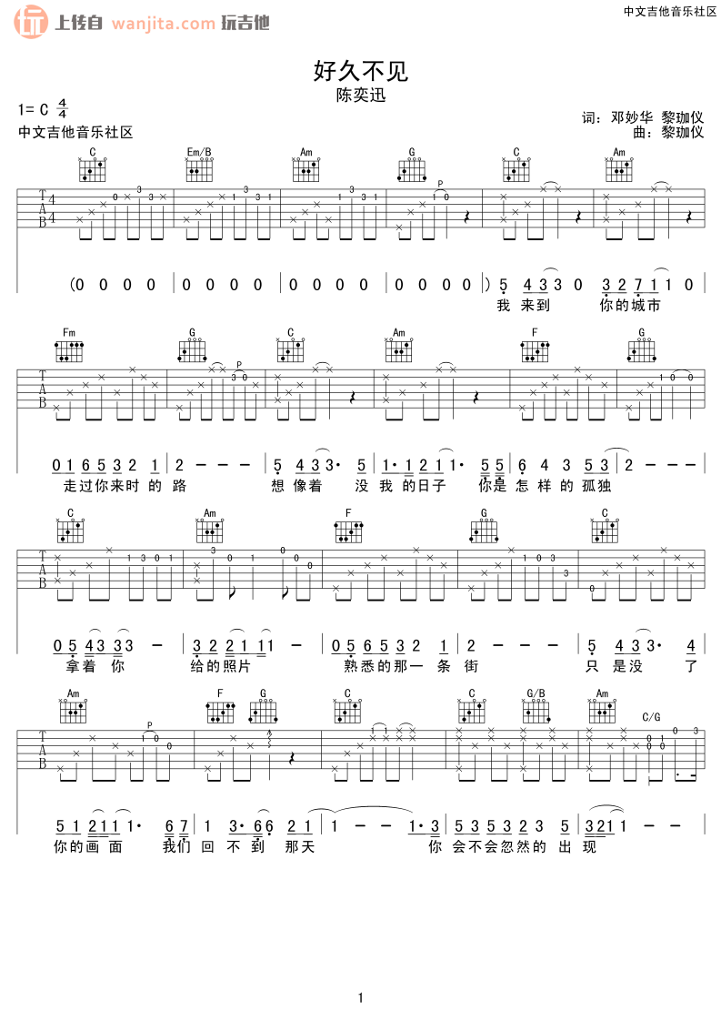曲谱介绍: 陈奕迅《好久不见》吉他弹唱谱,采用C调指法编配,共有2张高清图谱,免翻页排版设计。