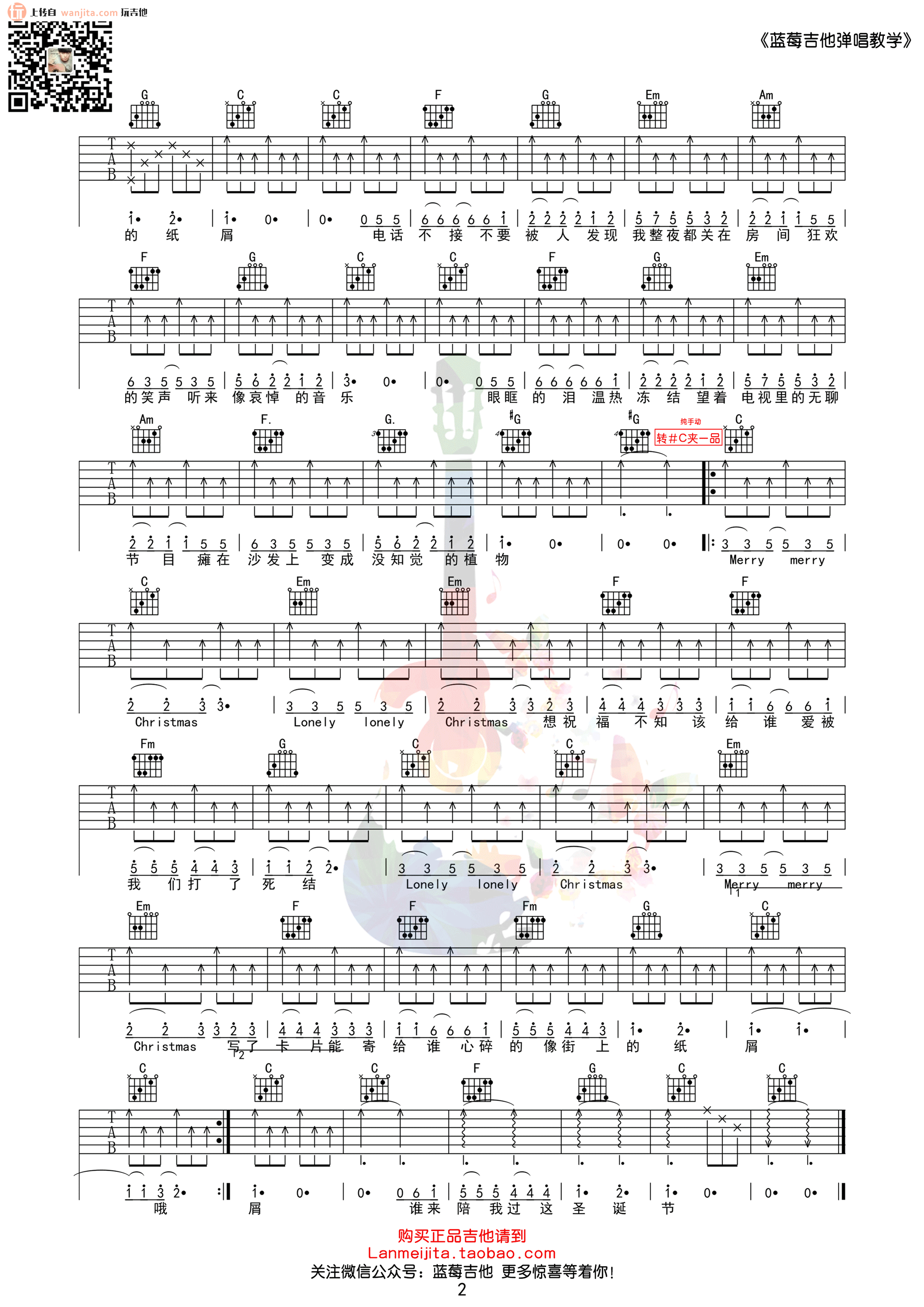 曲谱介绍: 《圣诞结》吉他谱【高清版】,总共2张高清图片谱,原调为C调转为升C调,节拍6/8拍,不使用变调夹,弹唱难度初级。