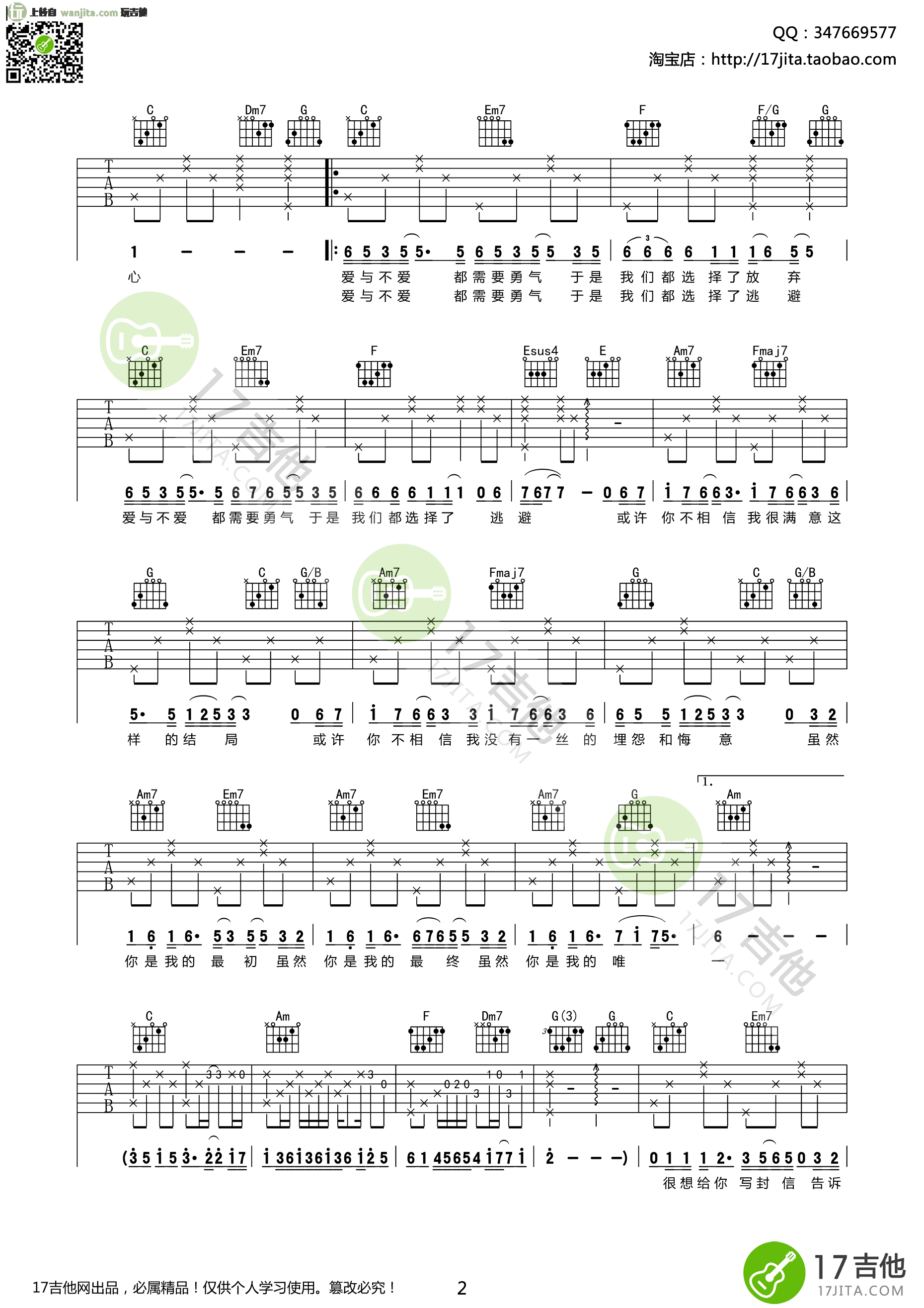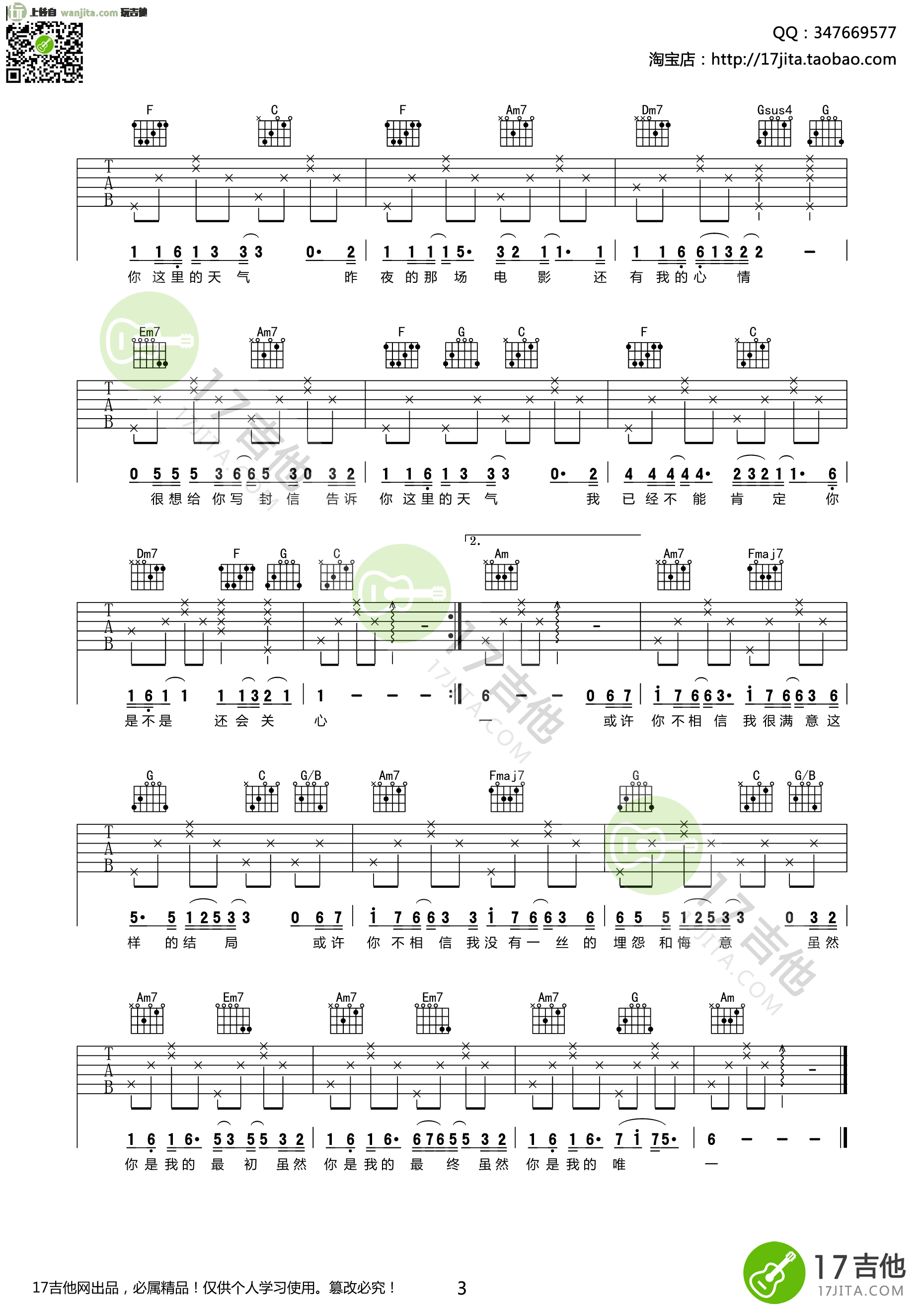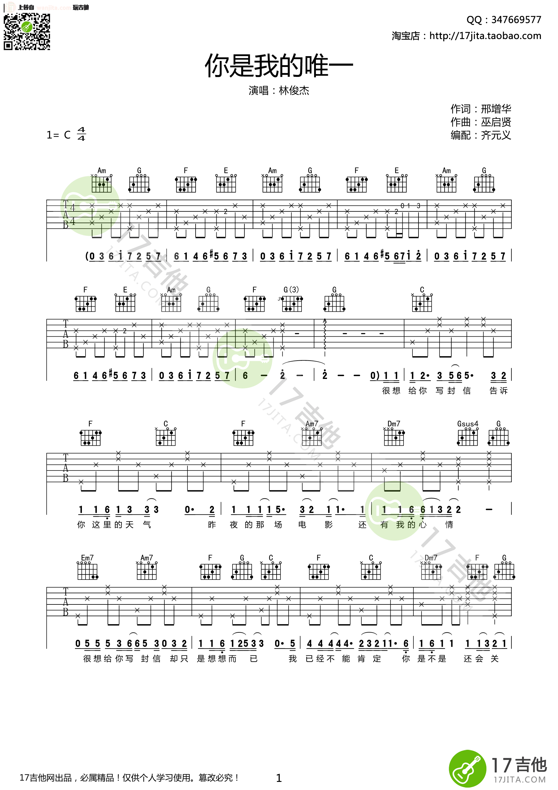曲谱介绍: 林俊杰《你是我的唯一》吉他弹唱谱,共有3张高清图谱。