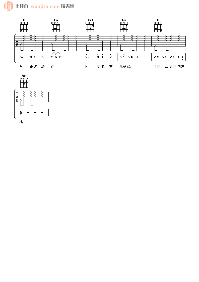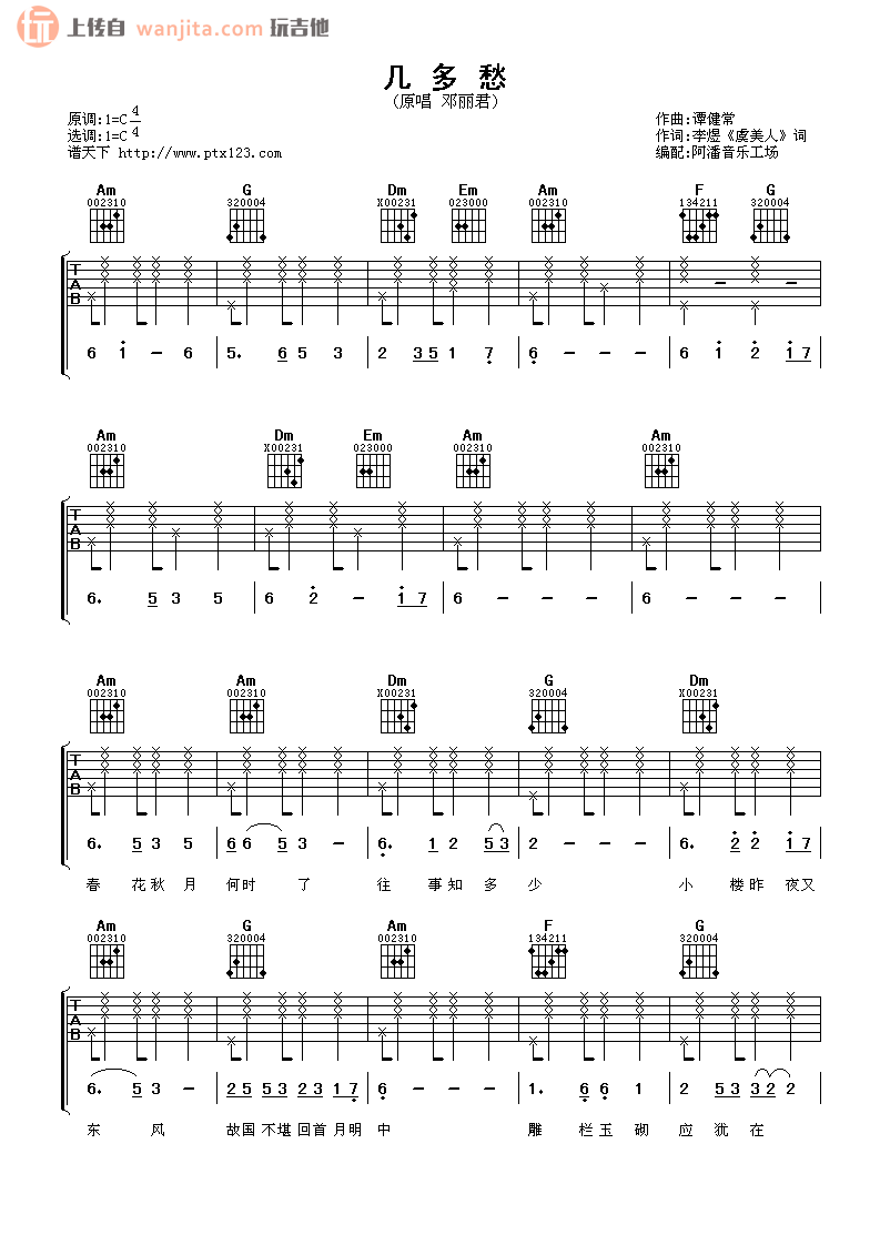 曲谱介绍: 邓丽君《几多愁》吉他谱,总共2张高清图片谱,原调为C调,选用C调指法,节拍4/4拍,不使用变调夹,弹唱难度初级。