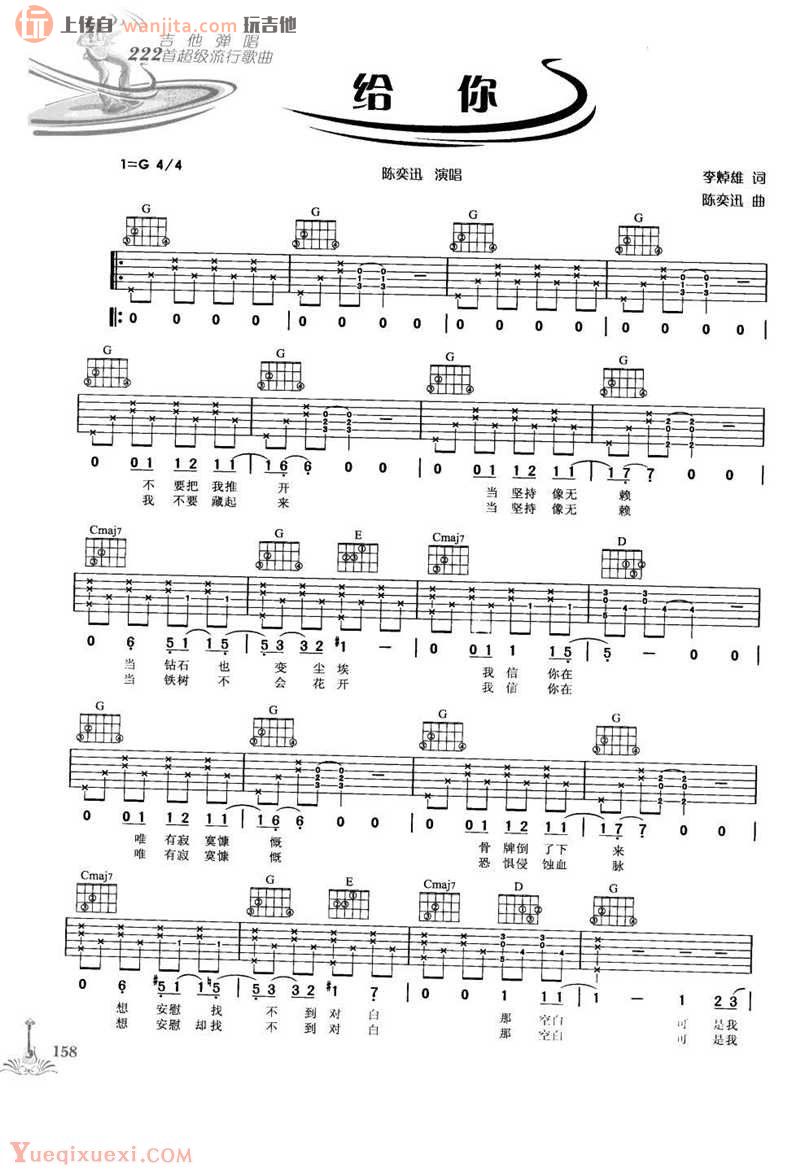 曲谱介绍: 陈奕迅《给你》吉他谱,总共2张高清图片谱,原调为G调,节拍4/4拍,不使用变调夹,弹唱难度初级。