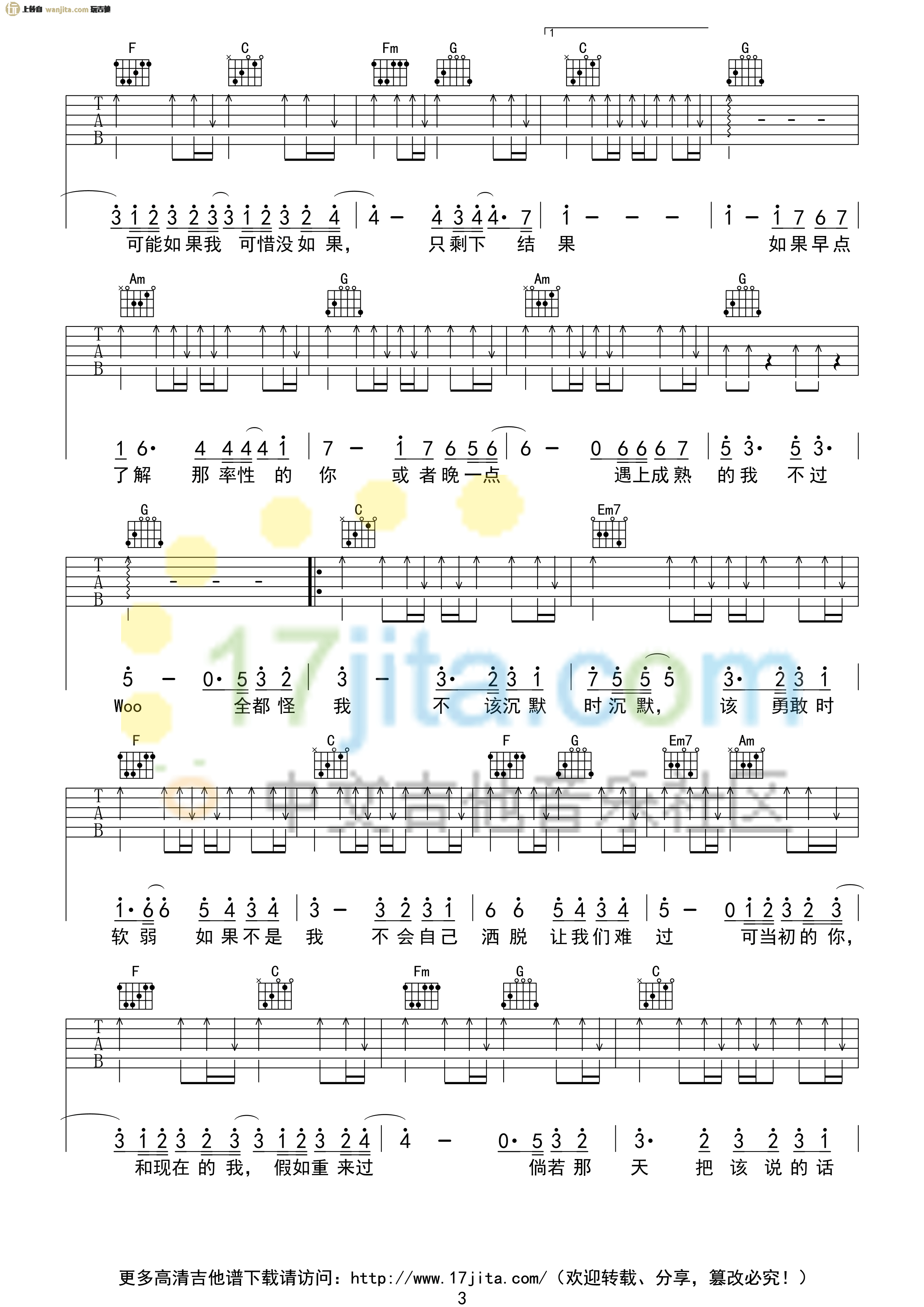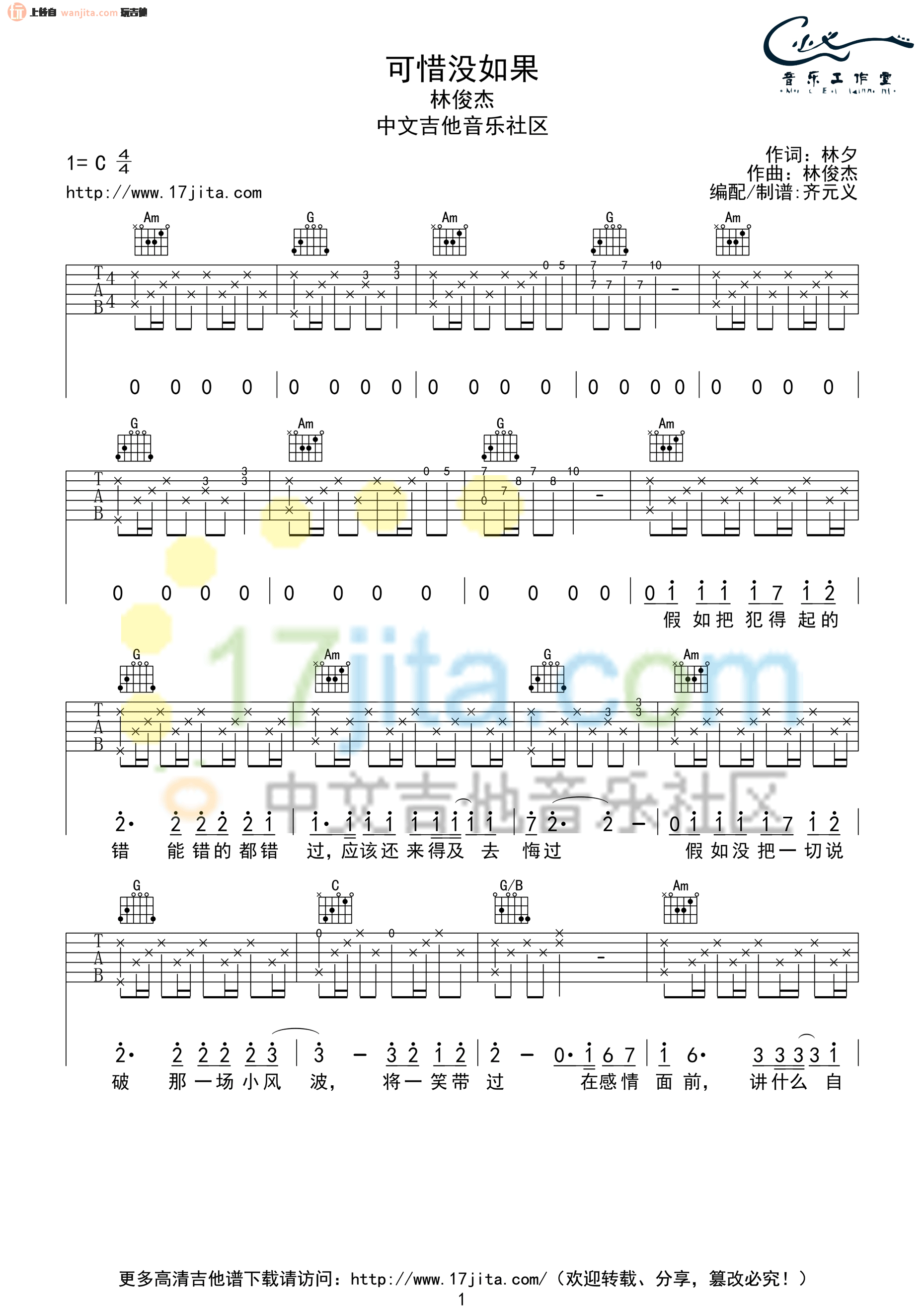 曲谱介绍: 林俊杰《可惜没如果》吉他谱,总共4张高清图片谱,选用C调指法,节拍4/4拍,不使用变调夹,弹唱难度初级。