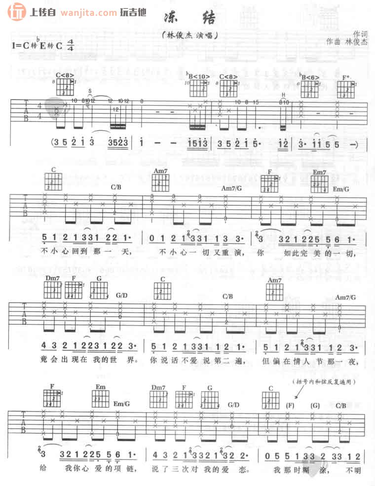 曲谱介绍: 林俊杰《冻结》吉他谱,总共3张高清图片谱,选用C调转降E调转C调,节拍4/4拍,不使用变调夹,弹唱难度适中,主要难点在于前奏的变换。