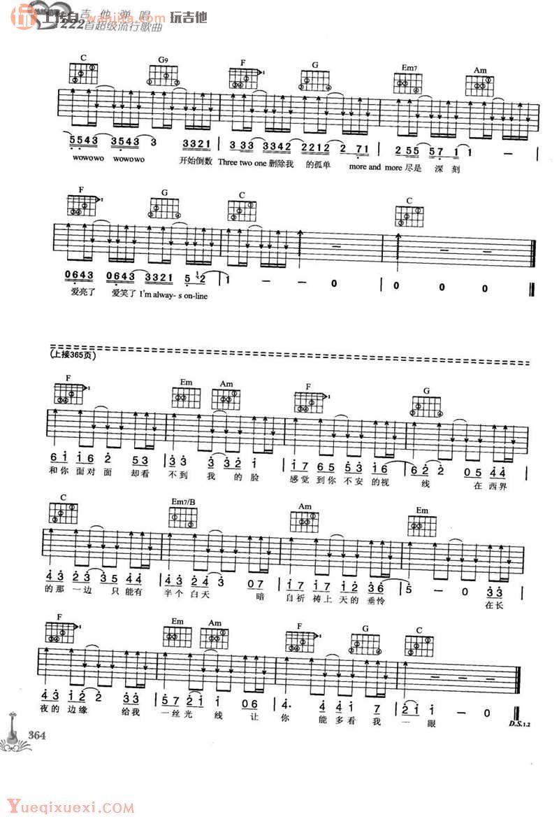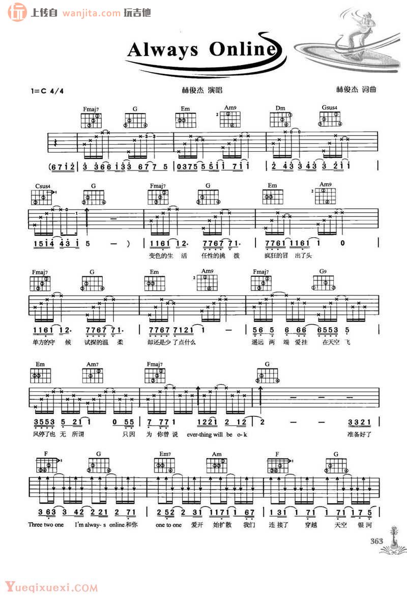 曲谱介绍: 林俊杰《Always Online》吉他谱,总共2张高清图片谱,选用C调指法,节拍4/4拍,不使用变调夹,弹唱难度初级。