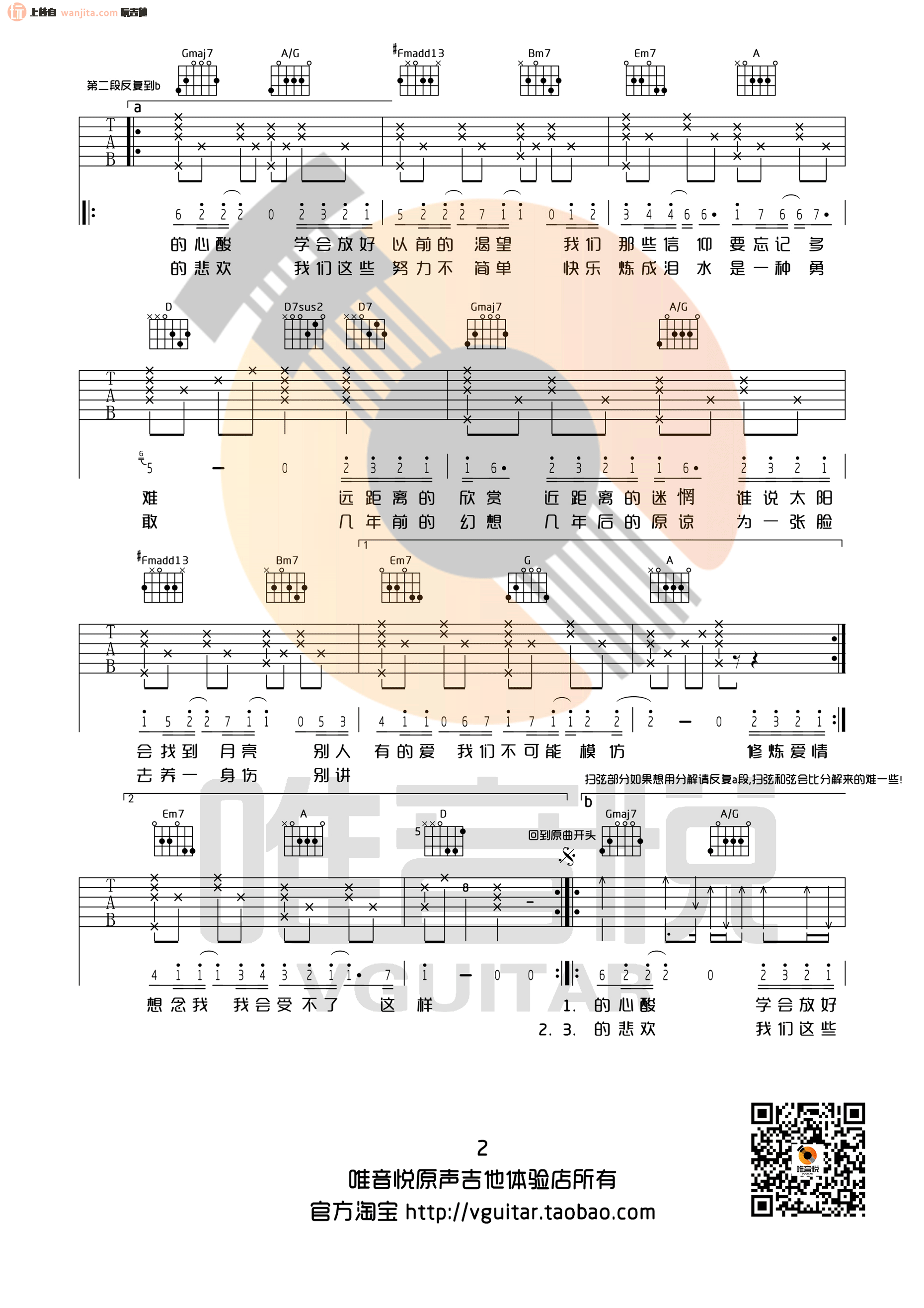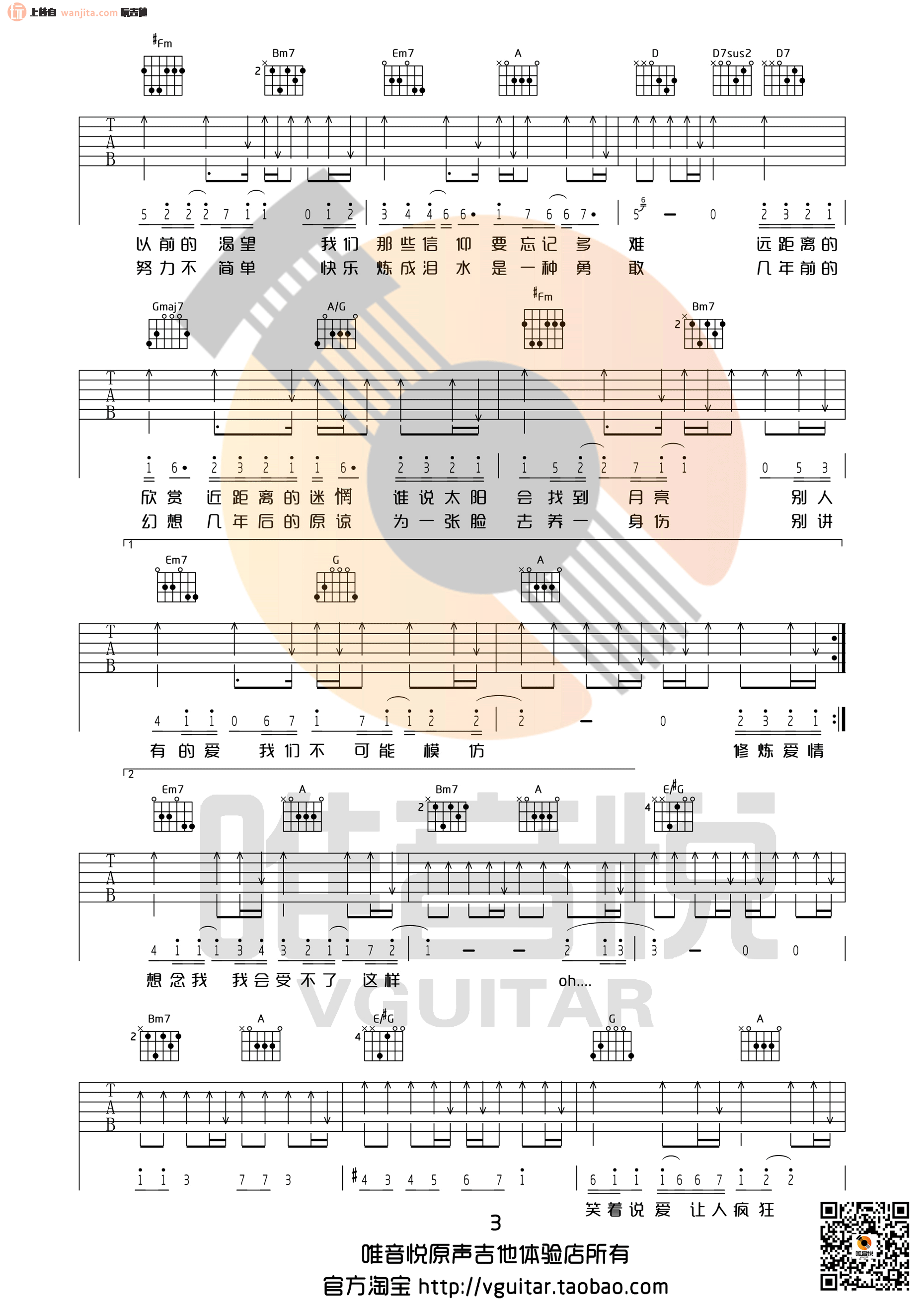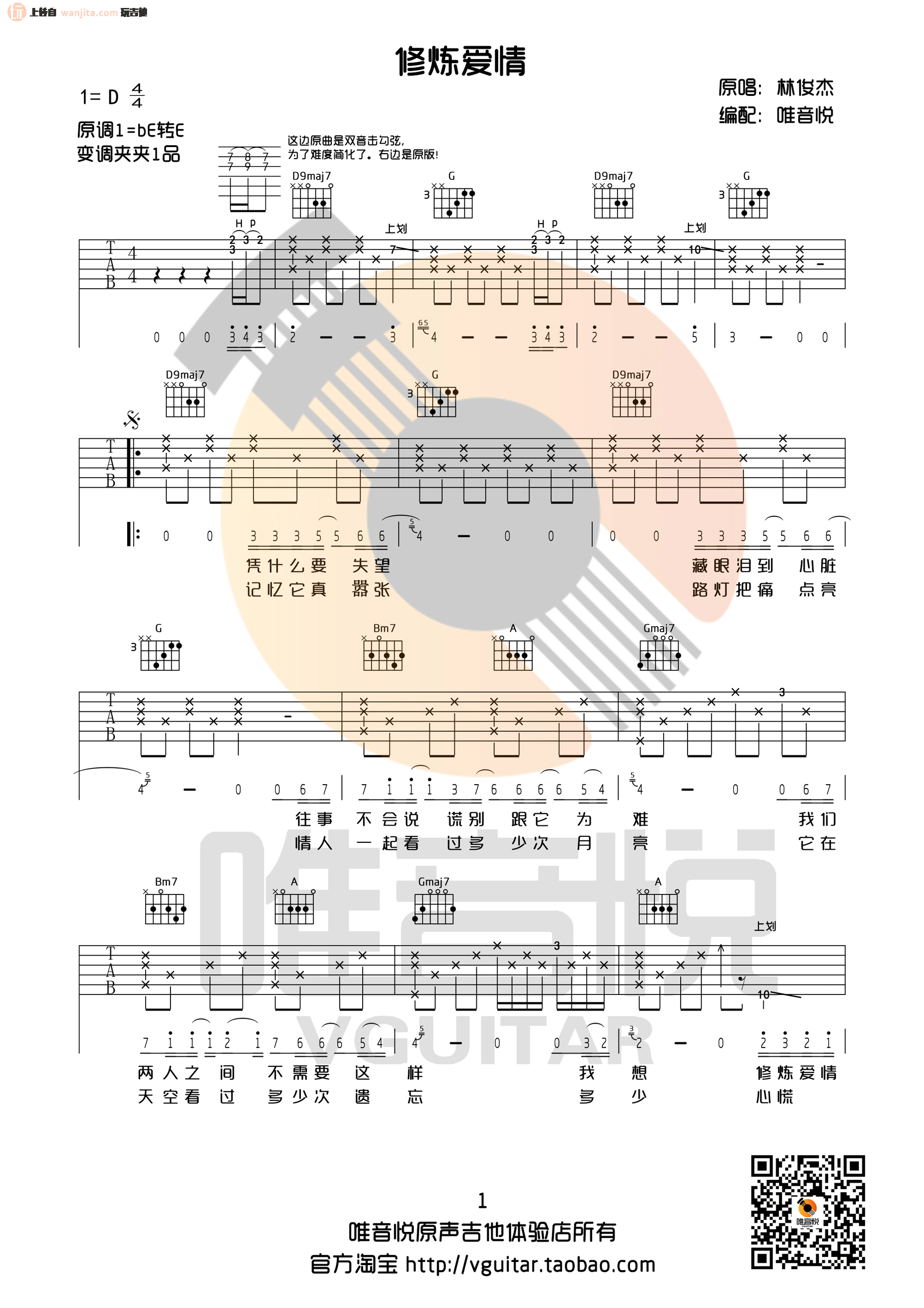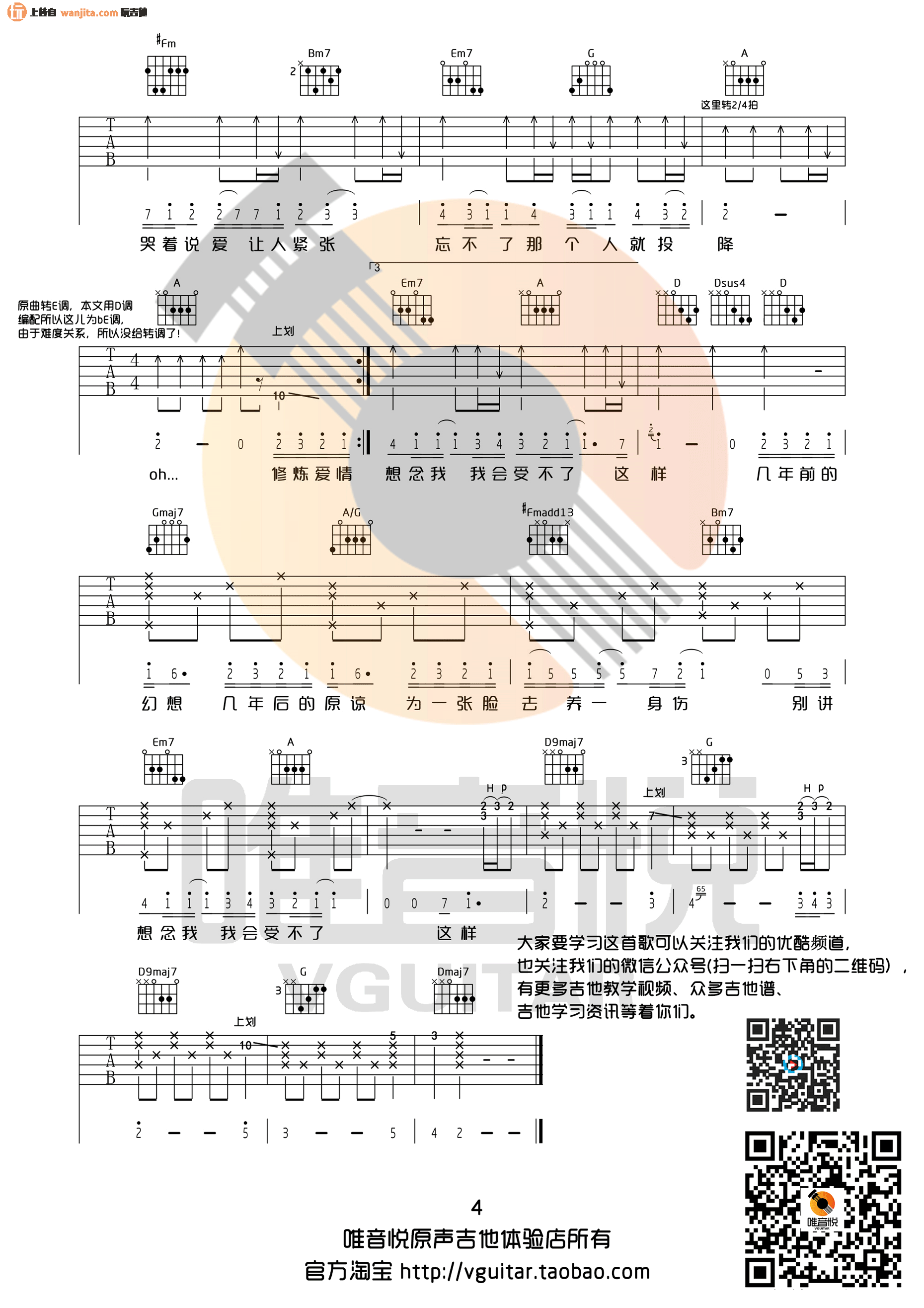 曲谱介绍: 修炼爱情吉他谱,总共4张高清图片谱,D调指法编配,原调是bE转E,来自唯音悦编配,这个版本比较简单,适合新手练习弹唱。