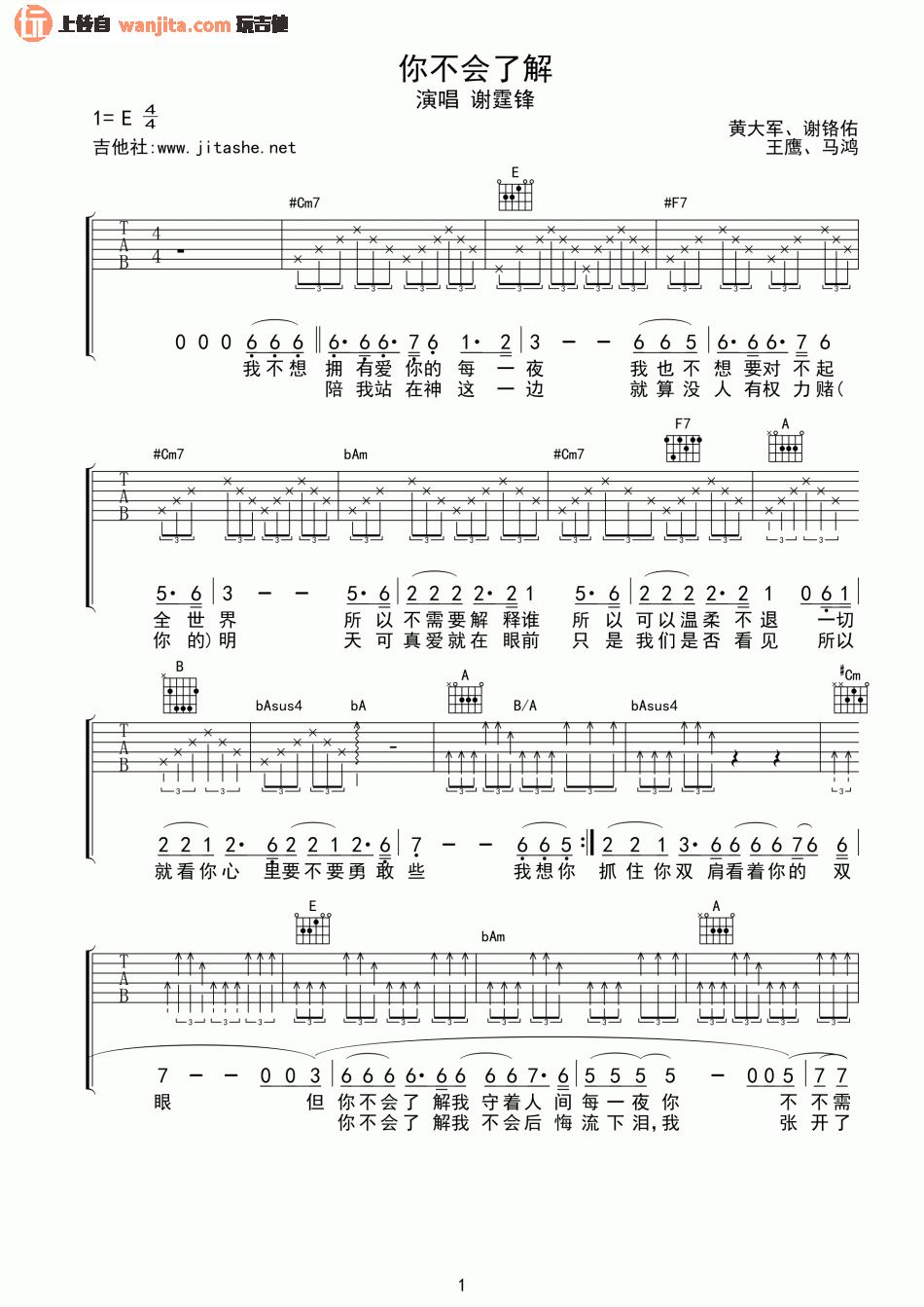 你不会了解吉他谱 - 谢霆锋 - E调吉他弹唱谱 - 原版