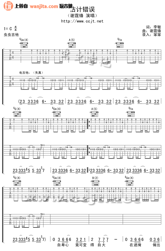 曲谱介绍: 谢霆锋《估计错误》吉他谱,由@笨笨制谱,总共1张高清图片谱,选用C调指法,节拍4/4拍,按原版编配含双吉他前奏,不使用变调夹,弹唱难度初级。