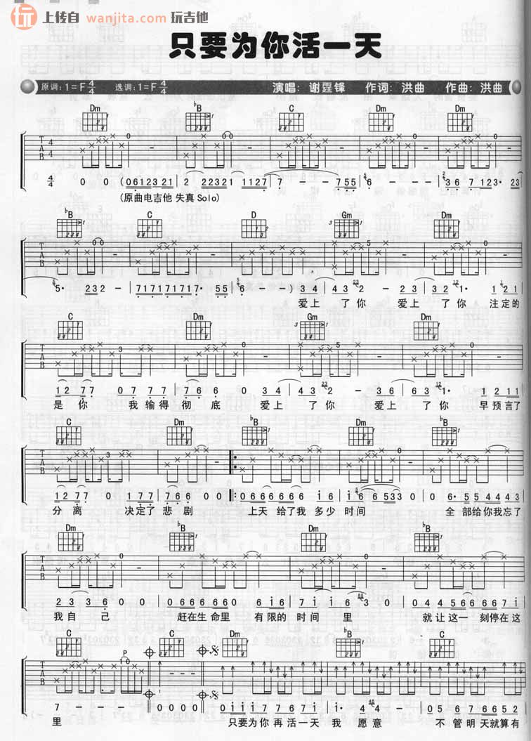 曲谱介绍: 谢霆锋《只要为你活一天》吉他谱,总共2张高清图片谱,原调为F调,选用F调指法,节拍4/4拍,不使用变调夹,弹唱难度初级。