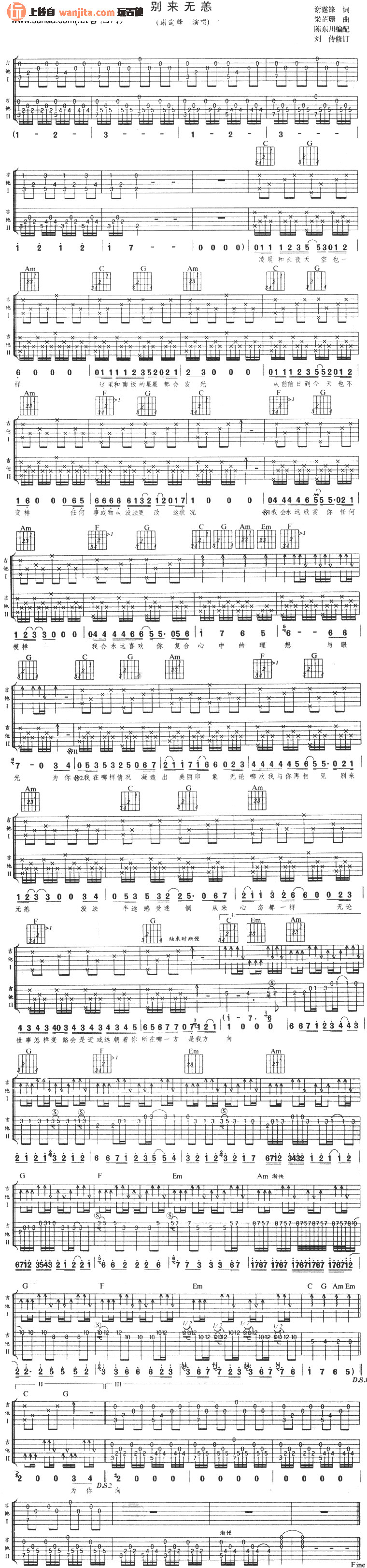 曲谱介绍: 谢霆锋《别来无恙》吉他谱,由刘传老师制谱,总共1张高清图片谱,节拍4/4拍,不使用变调夹,弹唱难度初级。