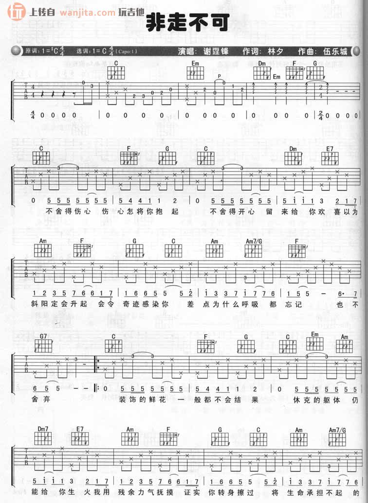 曲谱介绍: 谢霆锋《非走不可》吉他谱,总共2张高清图片谱,原调为升C,选用C调指法,节拍4/4拍,建议使用变调夹夹一品,弹唱难度初级。