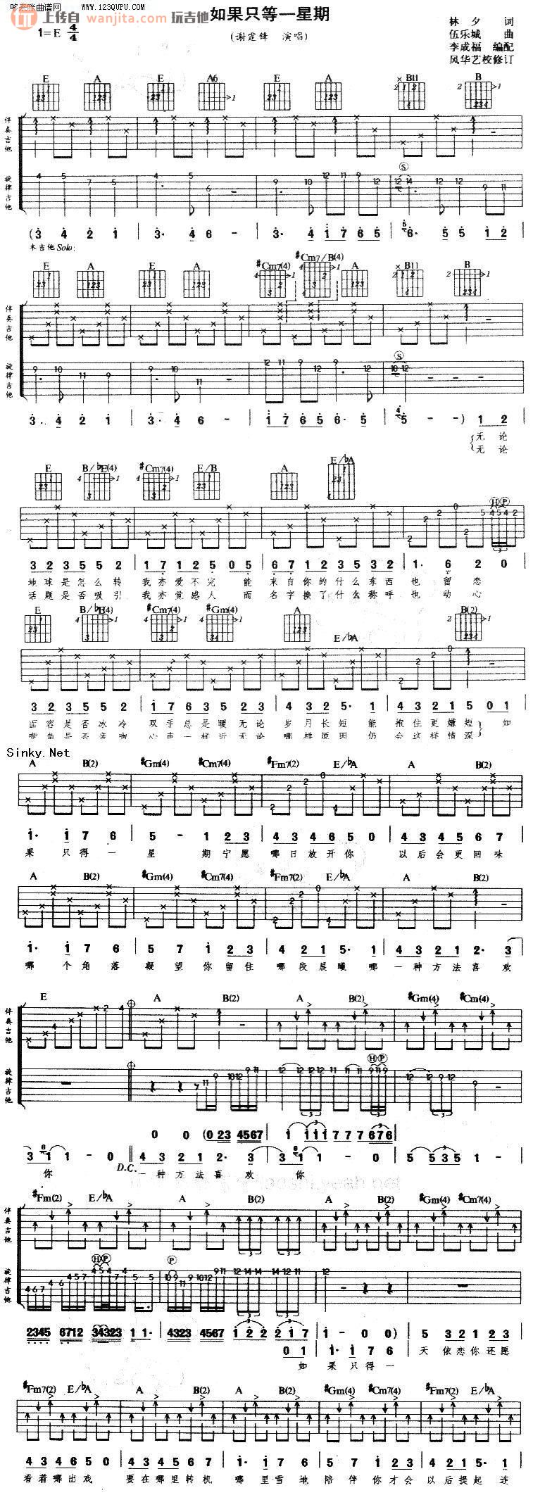 曲谱介绍: 谢霆锋《如果只得一星期》吉他谱,总共1张高清图片谱,选用E调指法,节拍4/4拍,不使用变调夹,弹唱难度初级。