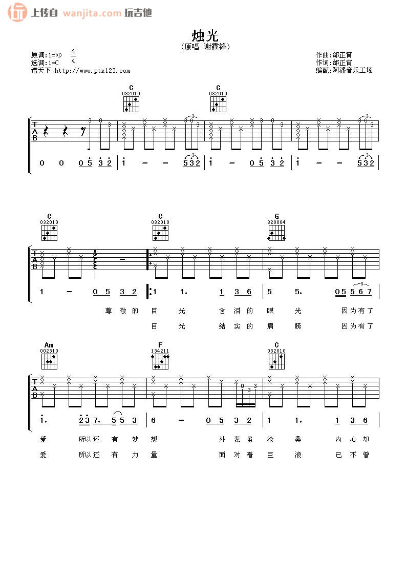 曲谱介绍: 谢霆锋《烛光》吉他谱,总共3张高清图片谱,原调为降D调,选用C调指法,节拍4/4拍,不使用变调夹,弹唱难度初级。