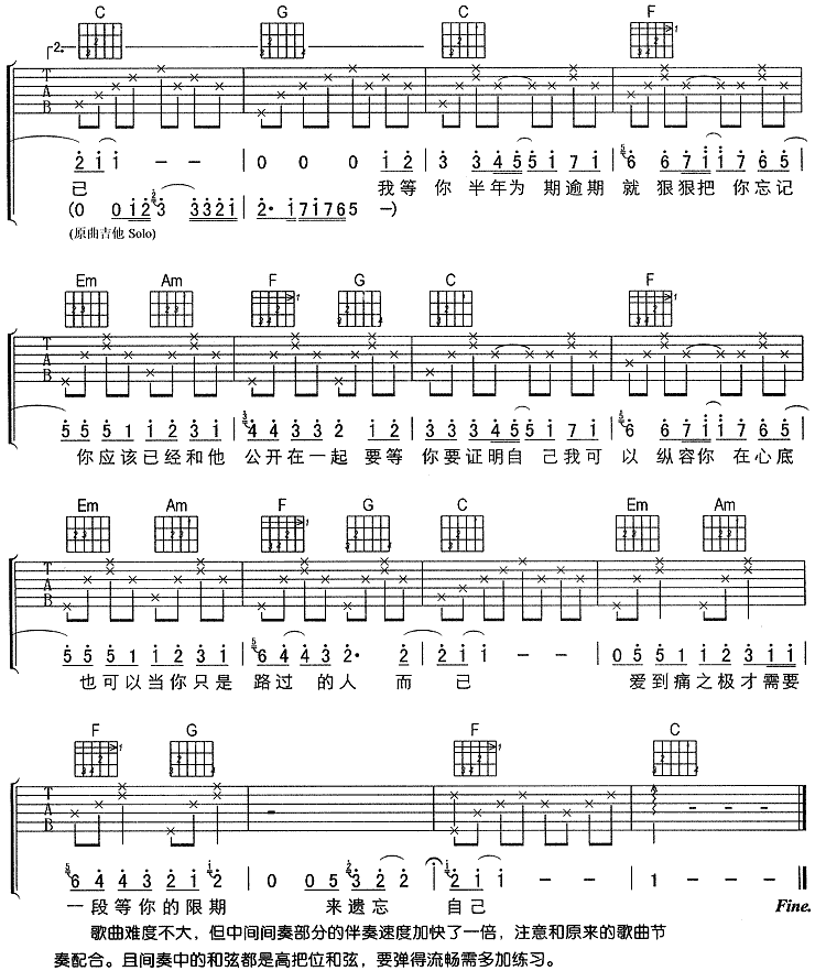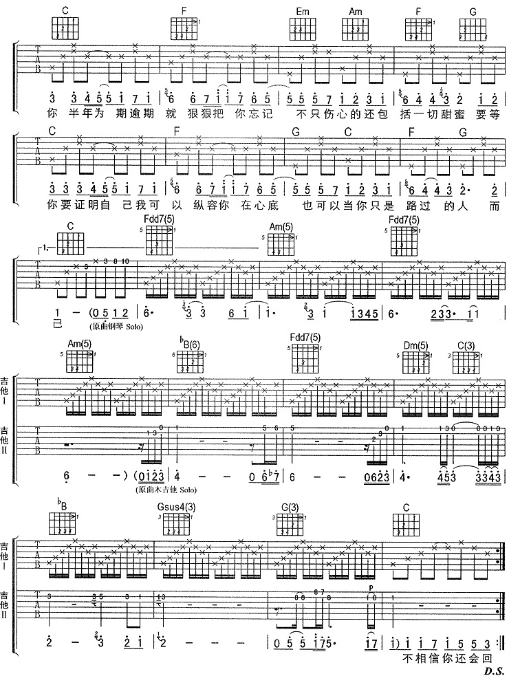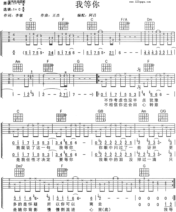 曲谱介绍: 刘若英《我等你》吉他谱,总共3张高清图片谱,本谱为C调吉他弹唱谱,节拍4/4拍,可不使用变调夹,弹唱难度初级。
