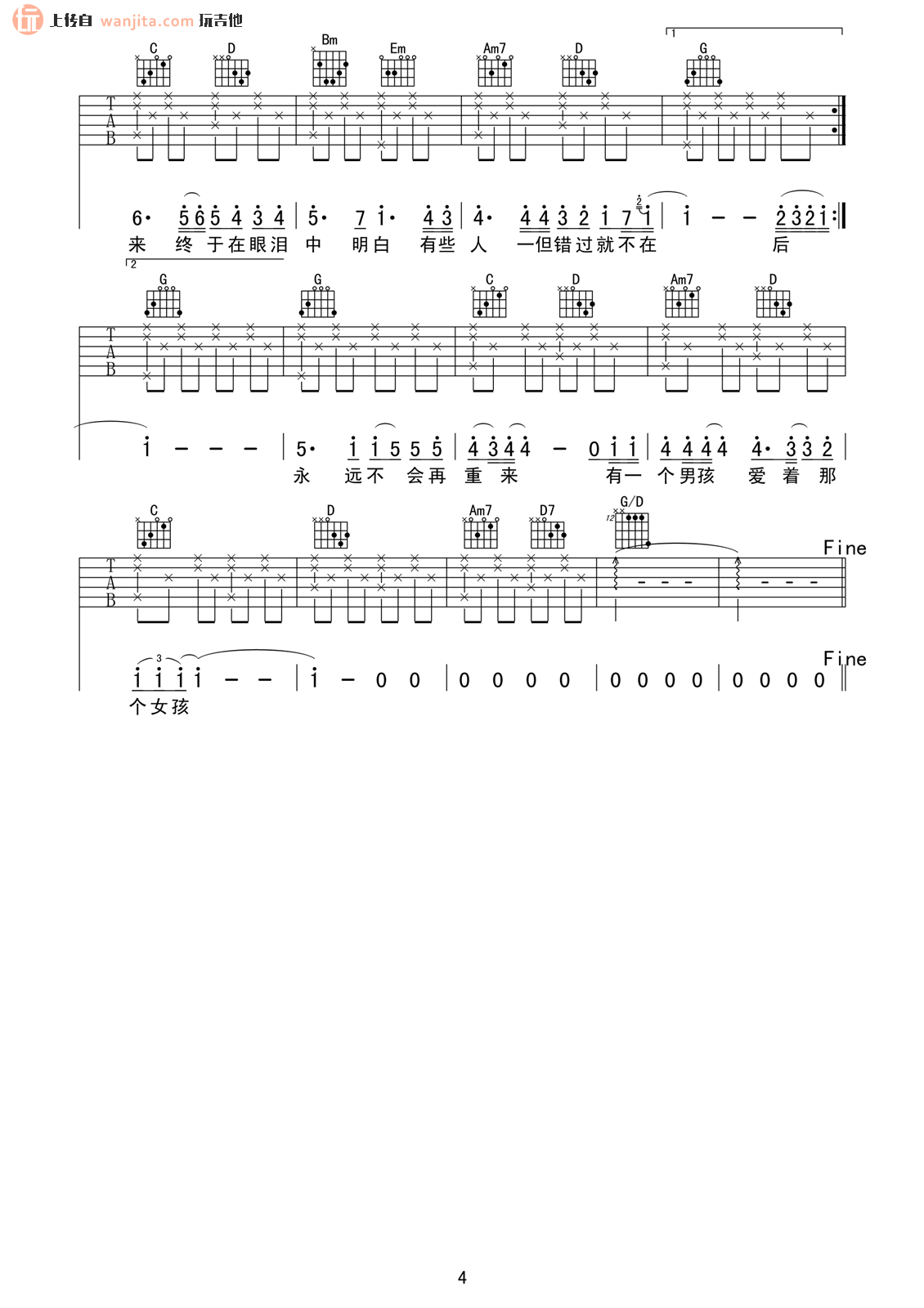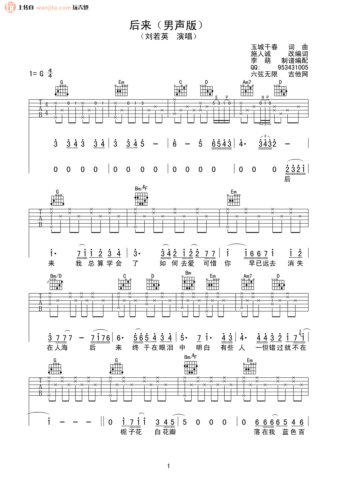 曲谱介绍: 《后来》吉他谱【高清弹唱谱】,由李萌制谱,共4张高清图片谱,男声演唱的版本,选用G调编配,可不用变调夹弹唱,包含简单版前奏,节奏4/4拍,难度较简单。