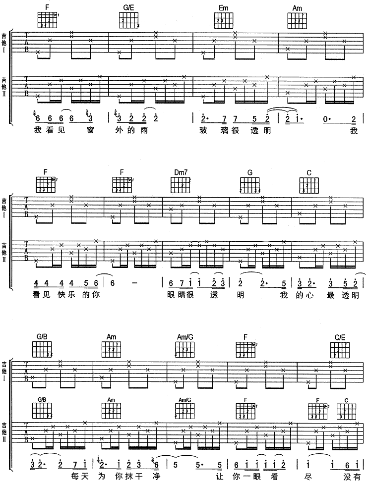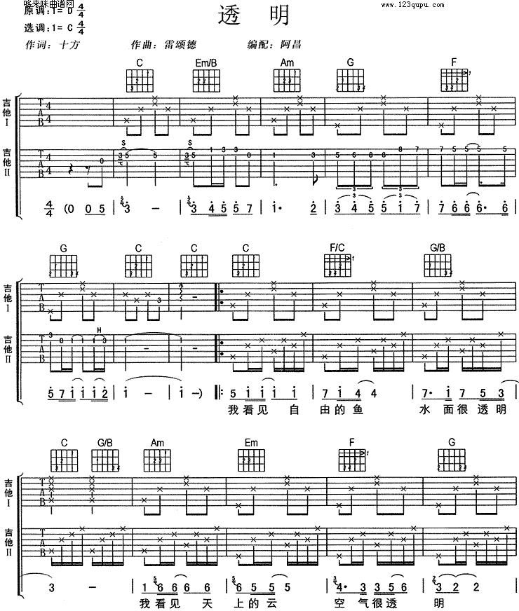 曲谱介绍: 刘若英《透明》吉他谱,由阿昌编配制谱,总共1张高清图片谱,节拍4/4拍,不使用变调夹,弹唱难度初级。
