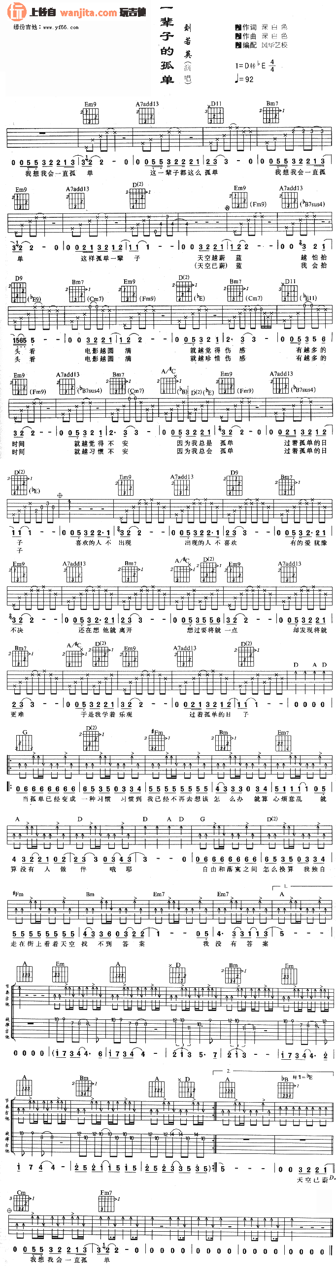 曲谱介绍: 刘若英《一辈子的孤单》吉他谱,总共1张高清图片谱,选用D调转降E调指法,速度每分钟92BPM,节拍4/4拍,不使用变调夹,弹唱难度初级。