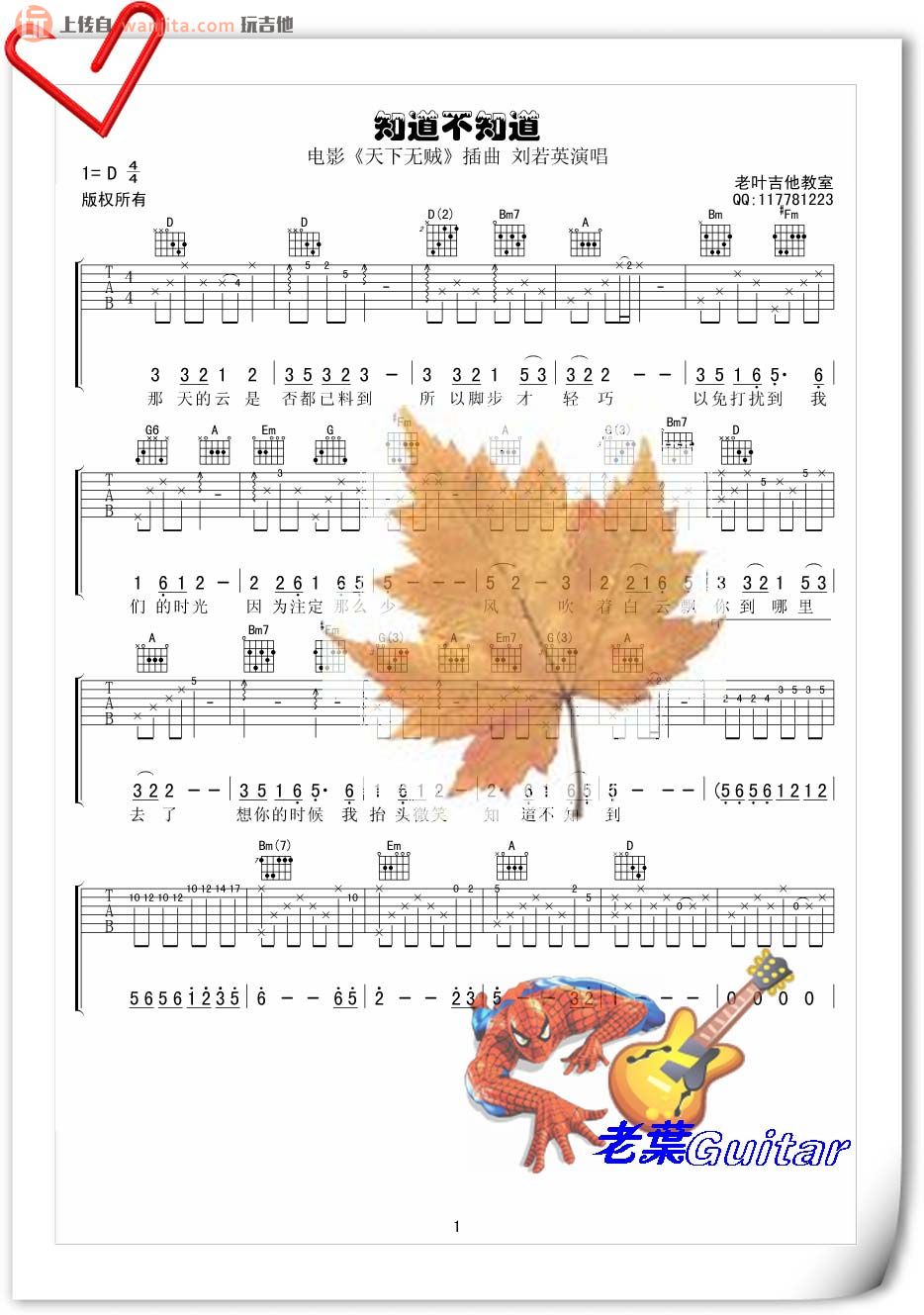 曲谱介绍: 《知道不知道》吉他谱,总共1张高清图片谱,选用D调指法,节拍4/4拍,不使用变调夹,弹唱难度初级。
