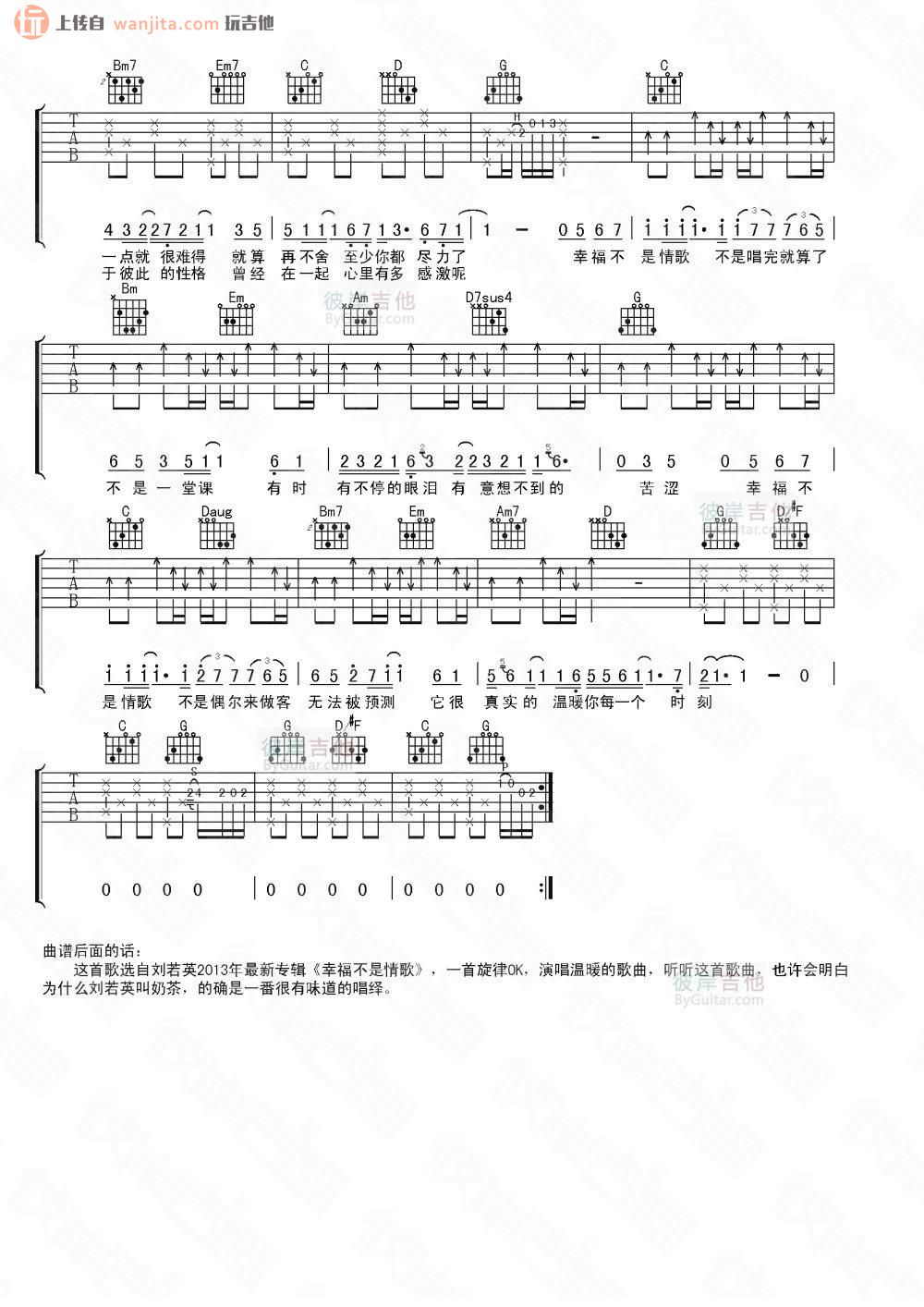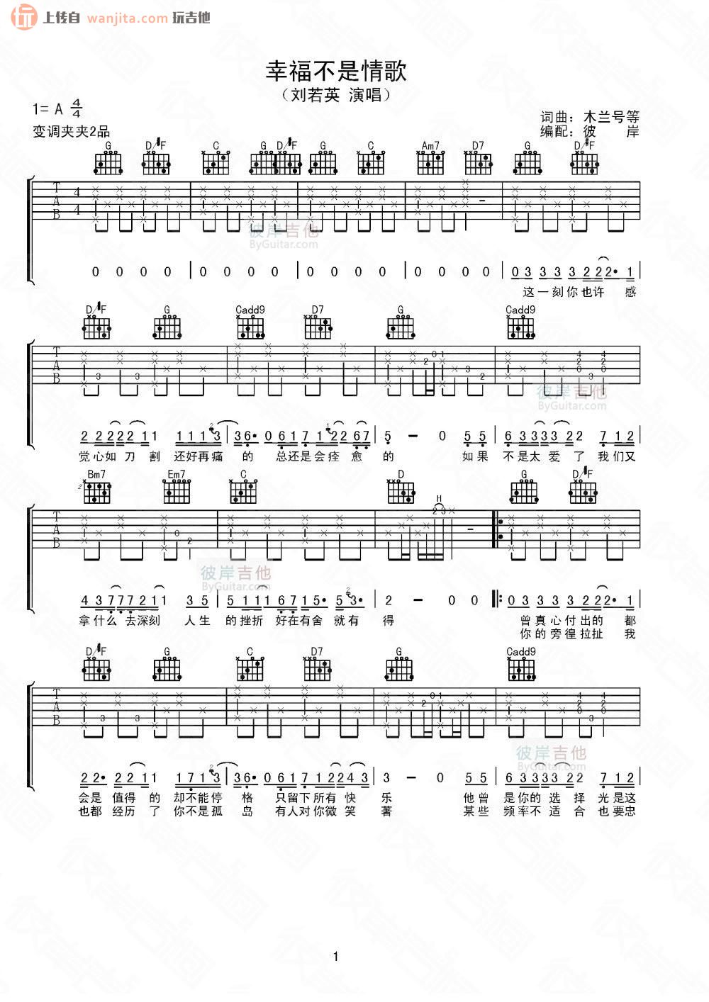 曲谱介绍: 刘若英《幸福不是情歌》吉他谱,总共2张高清图片谱,选用A调指法,节拍4/4拍,不使用变调夹,弹唱难度初级。