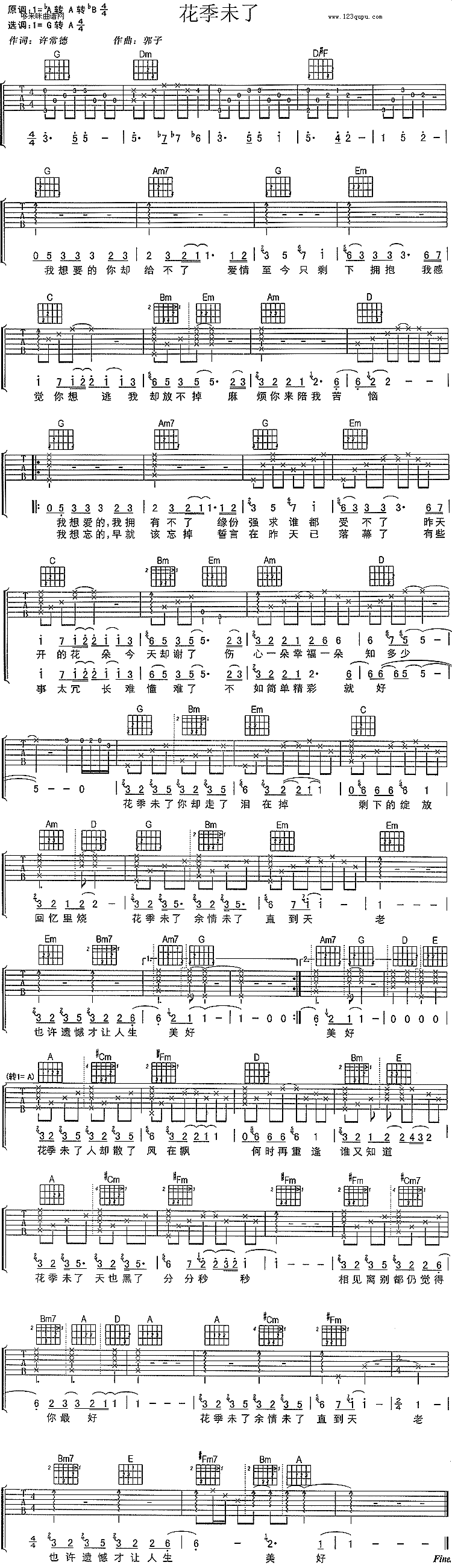 曲谱介绍: 刘若英《花季未了》吉他谱,总共1张高清图片谱,原调为降A调转A调转降B调,选用G调转A调指法,节拍4/4拍,不使用变调夹,弹唱难度初级。