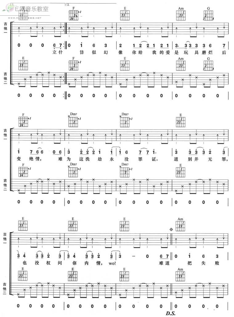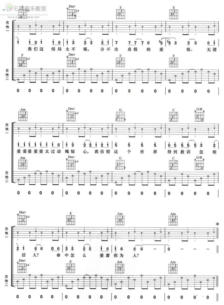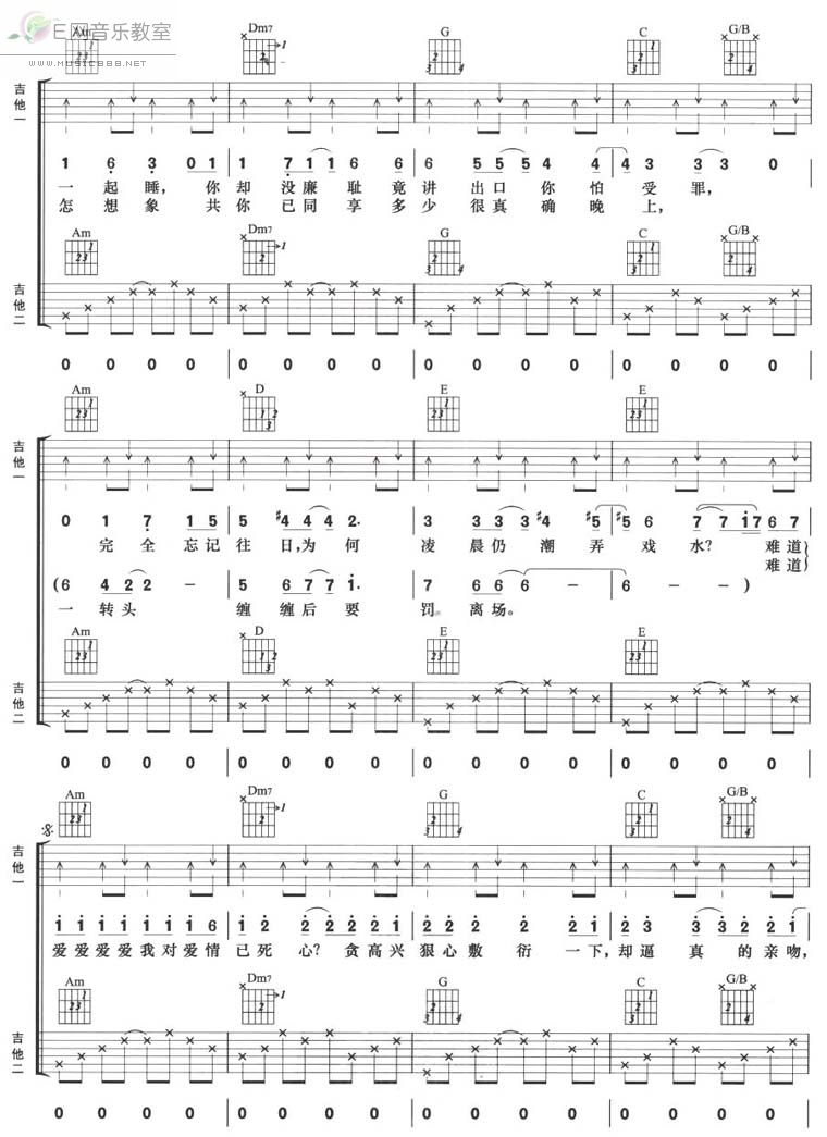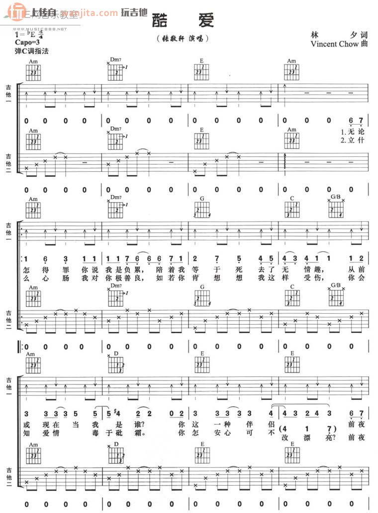 曲谱介绍: 张敬轩《酷爱》吉他谱,总共5张高清图片谱,原调为降E调,选用C调指法,节拍4/4拍,建议使用变调夹夹三品,弹唱难度初级。