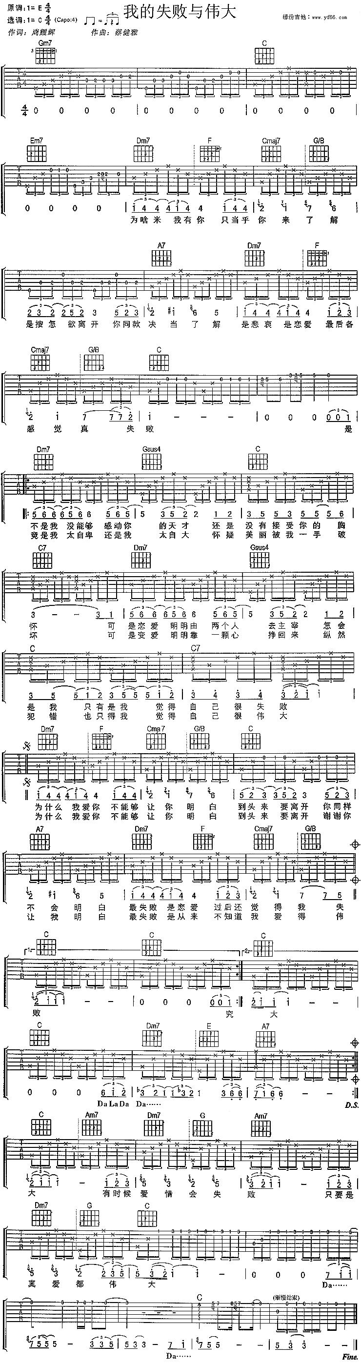 曲谱介绍: 刘若英《我的失败与伟大》吉他谱,总共1张高清图片谱,原调为E调,选用C调指法,节拍4/4拍,建议使用变调夹夹4品,弹唱难度初级。