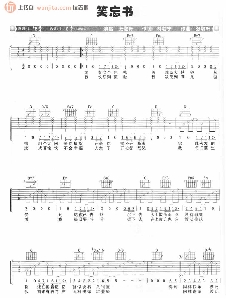 曲谱介绍: 张敬轩《笑忘书》吉他谱,总共1张高清图片谱,原调为降B调,选用G调指法,节拍4/4拍,建议使用变调夹夹三品,弹唱难度初级。