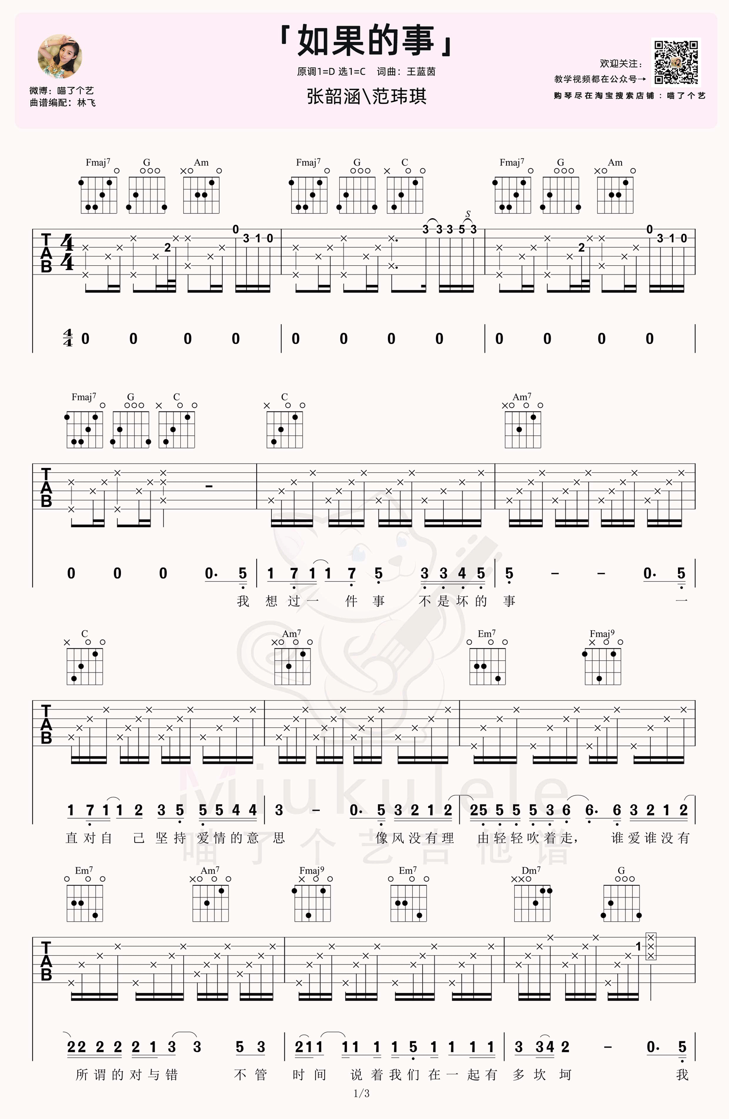 曲谱介绍: 张韶涵/范玮琪《如果的事》吉他弹唱谱,采用C调指法编配,共有3张高清图谱。
