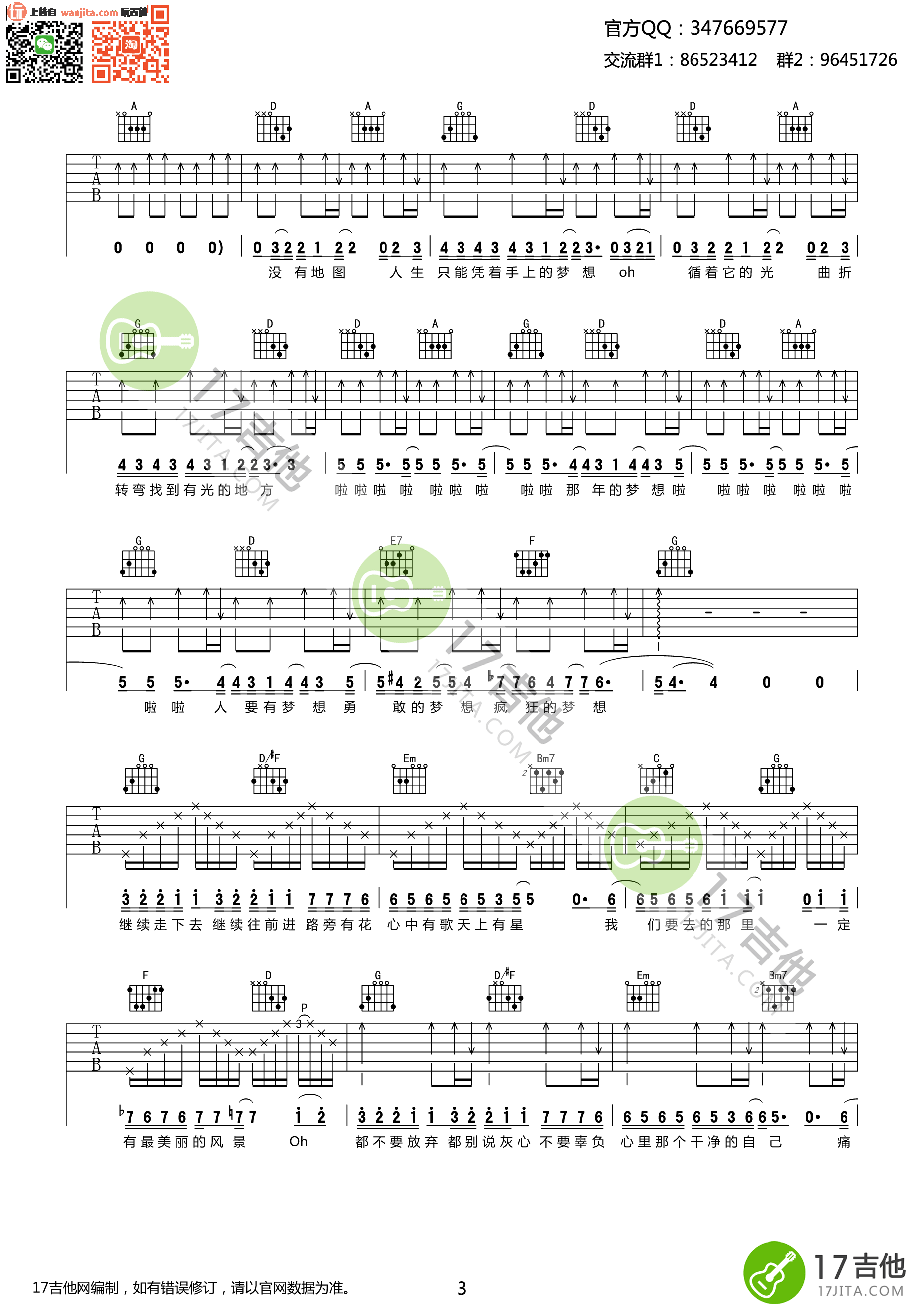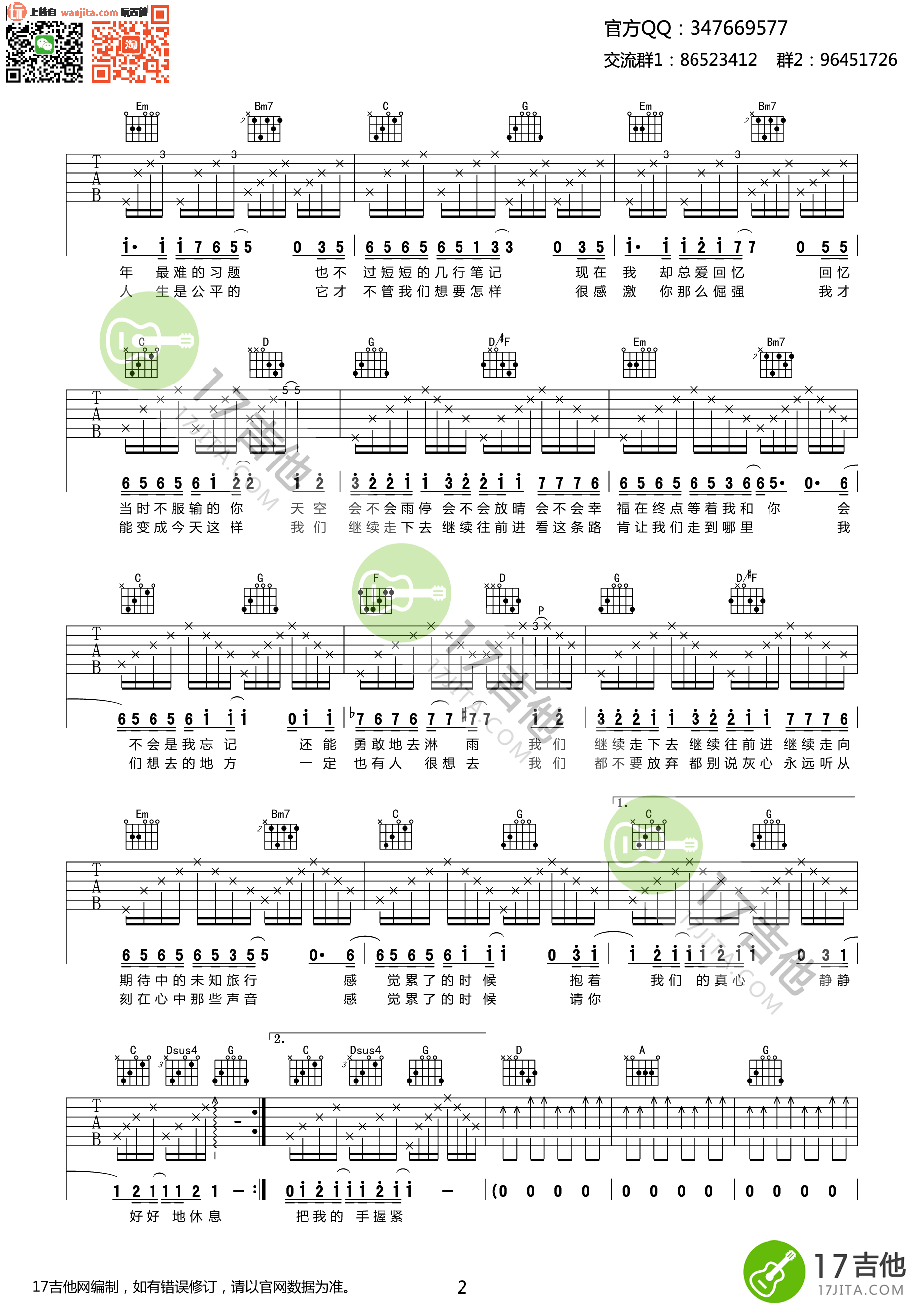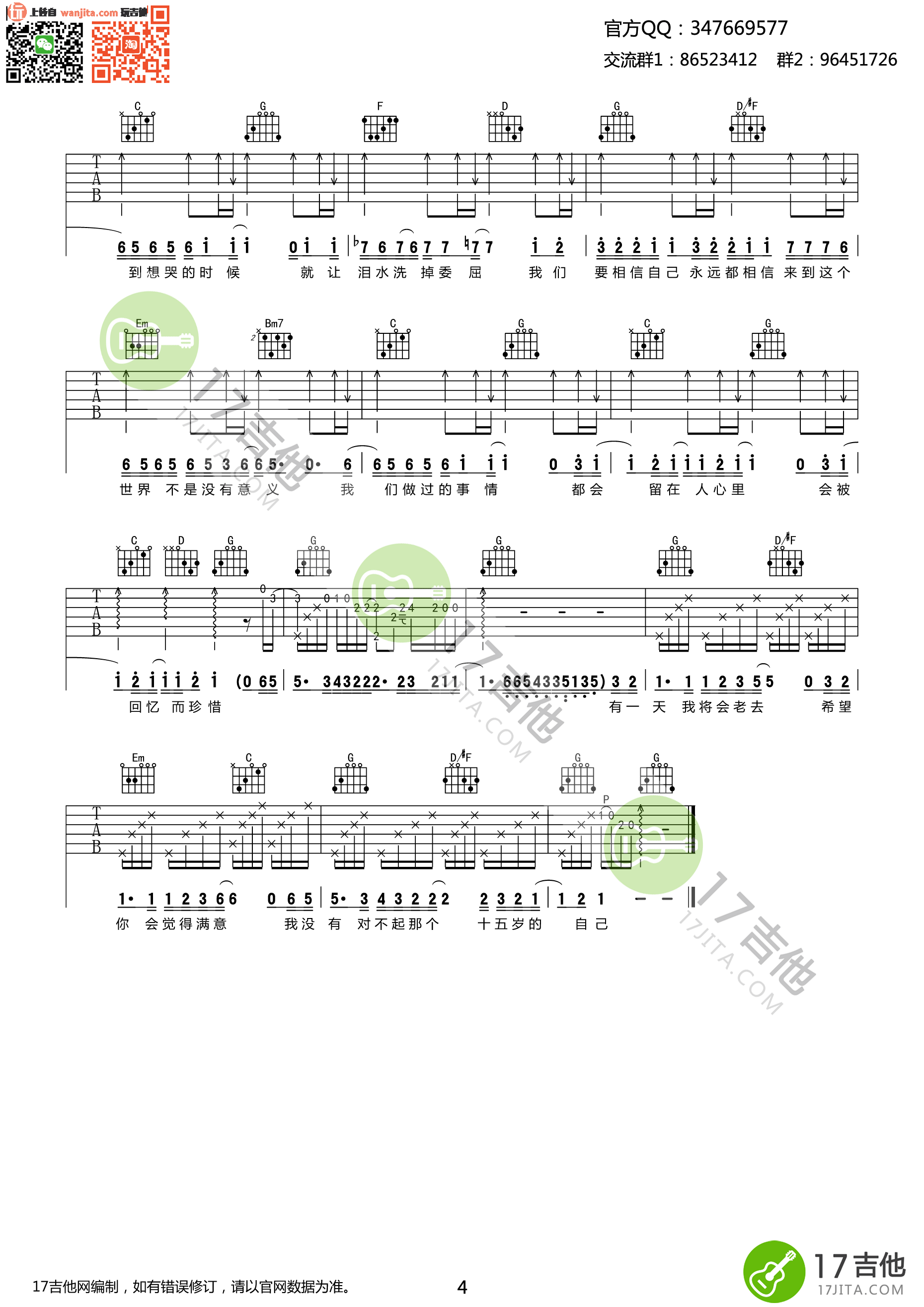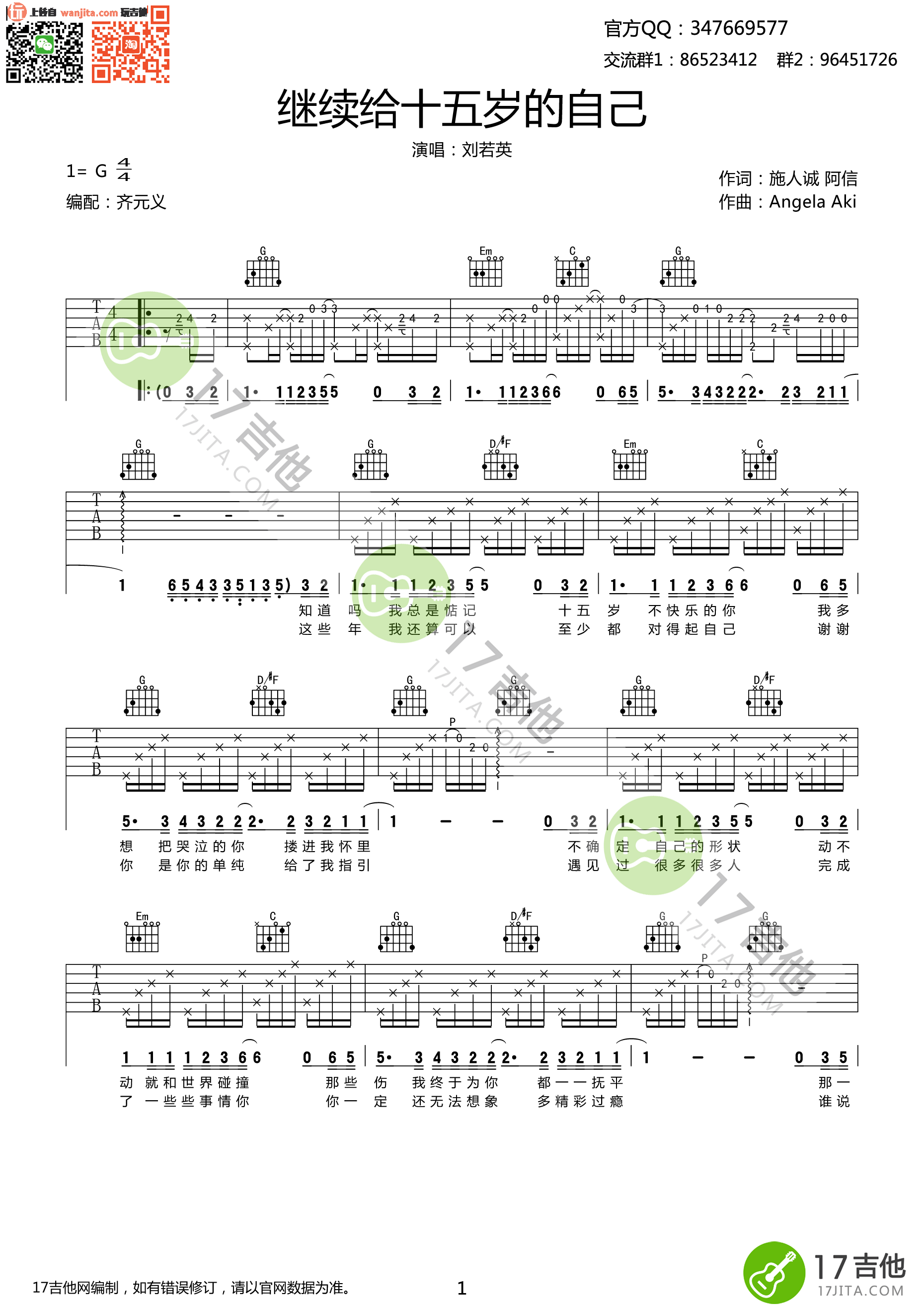 曲谱介绍: 《继续给十五岁的自己》吉他谱【高清版弹唱谱】,由齐元义编配制谱,总共4张高清图片谱,选用G调指法,节拍4/4拍,不使用变调夹,弹唱难度初级。